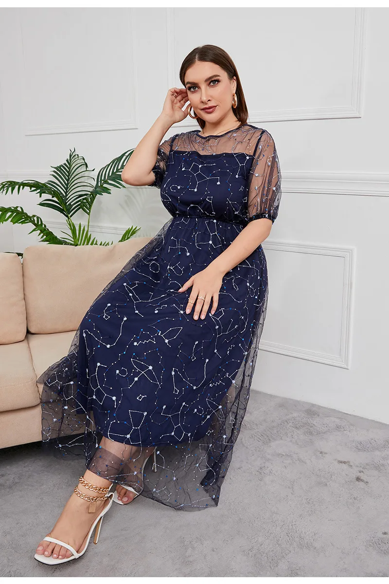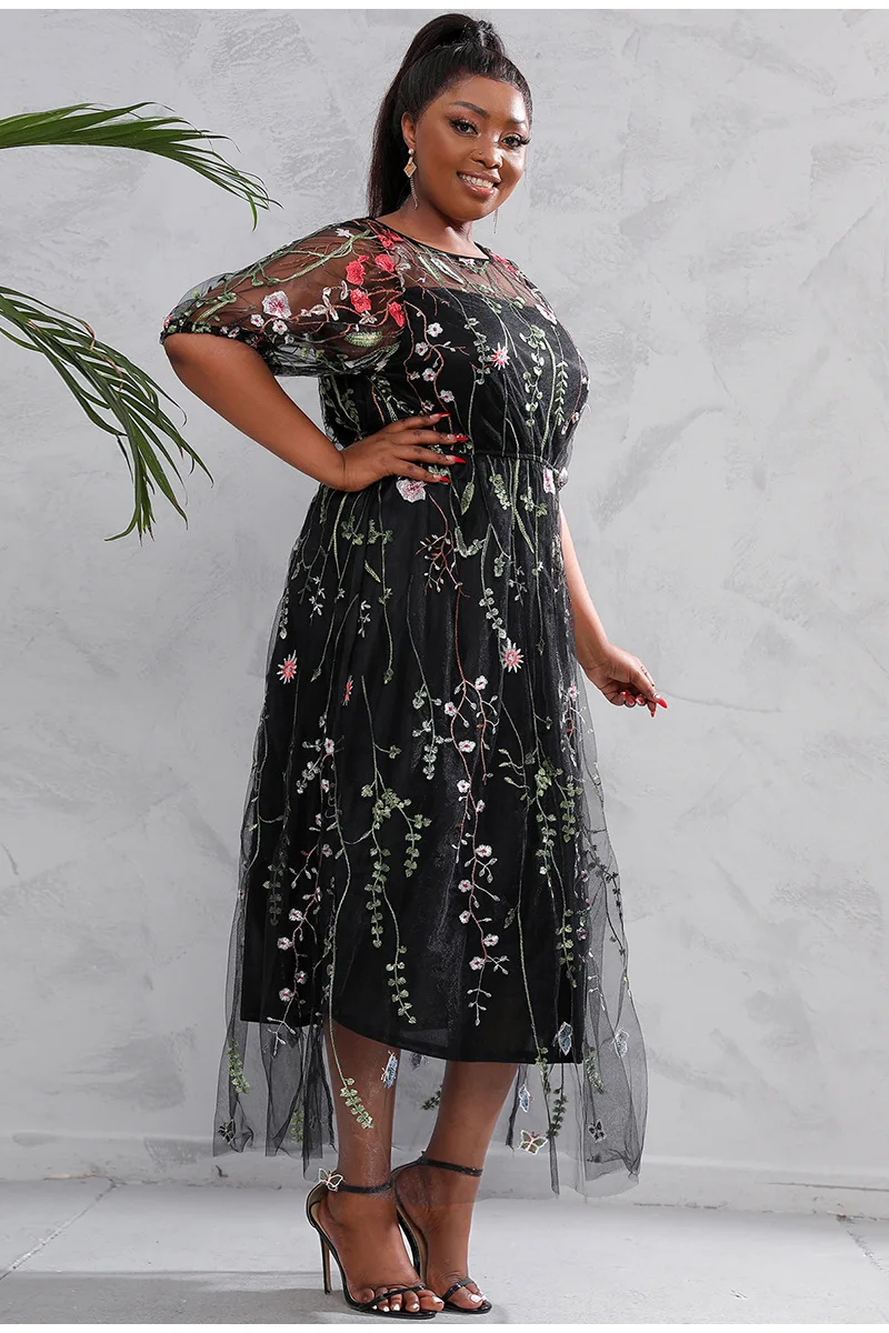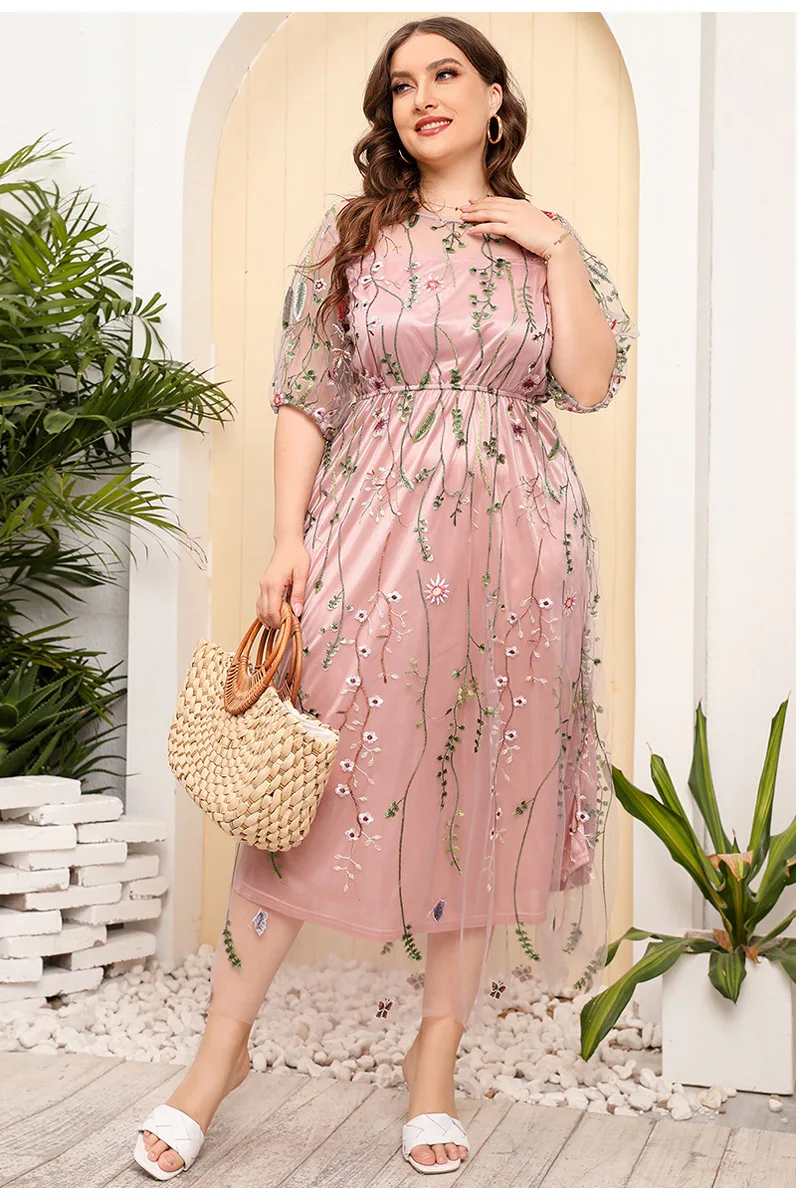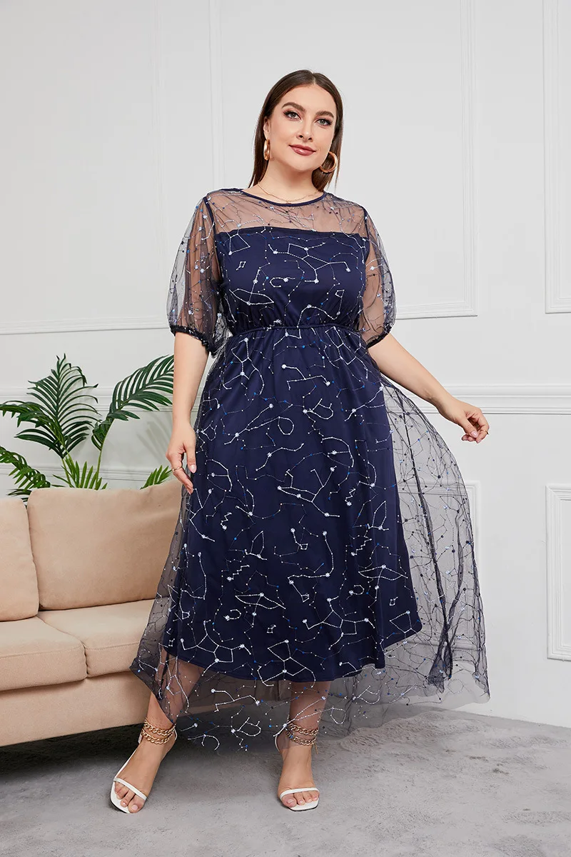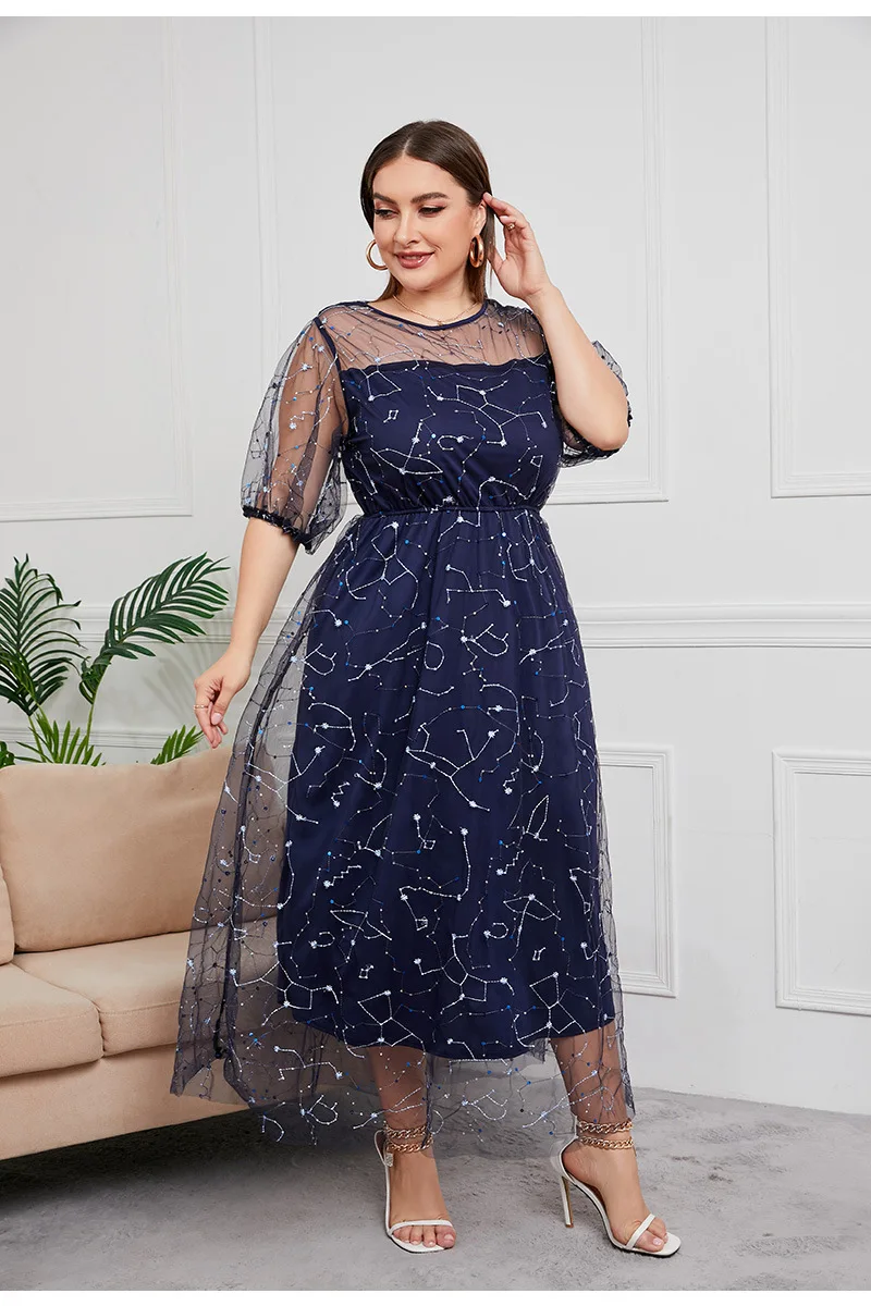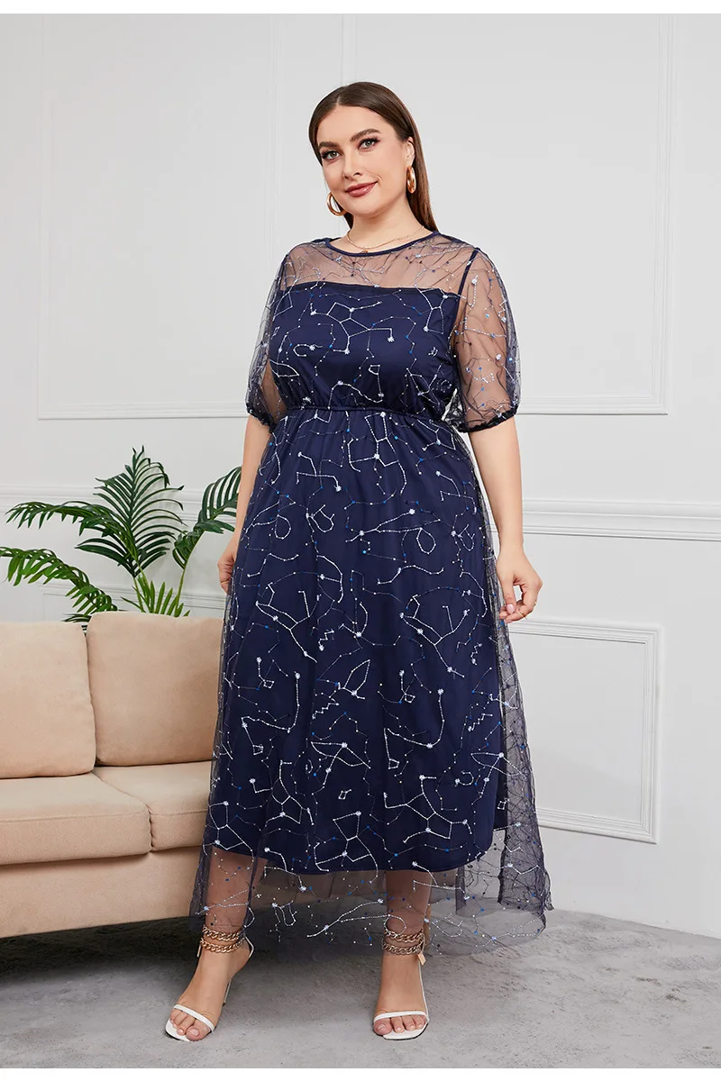 Vigojany 2025 Summer Mesh Patchwork Plus Size Dress Women O Neck Short Sleeve Large Big Dress Casual Lady Chubby Curvy Dresses
