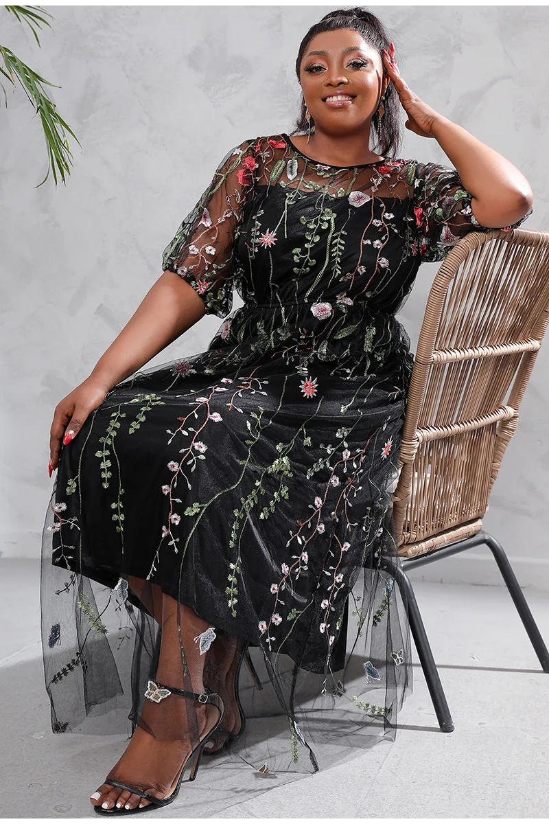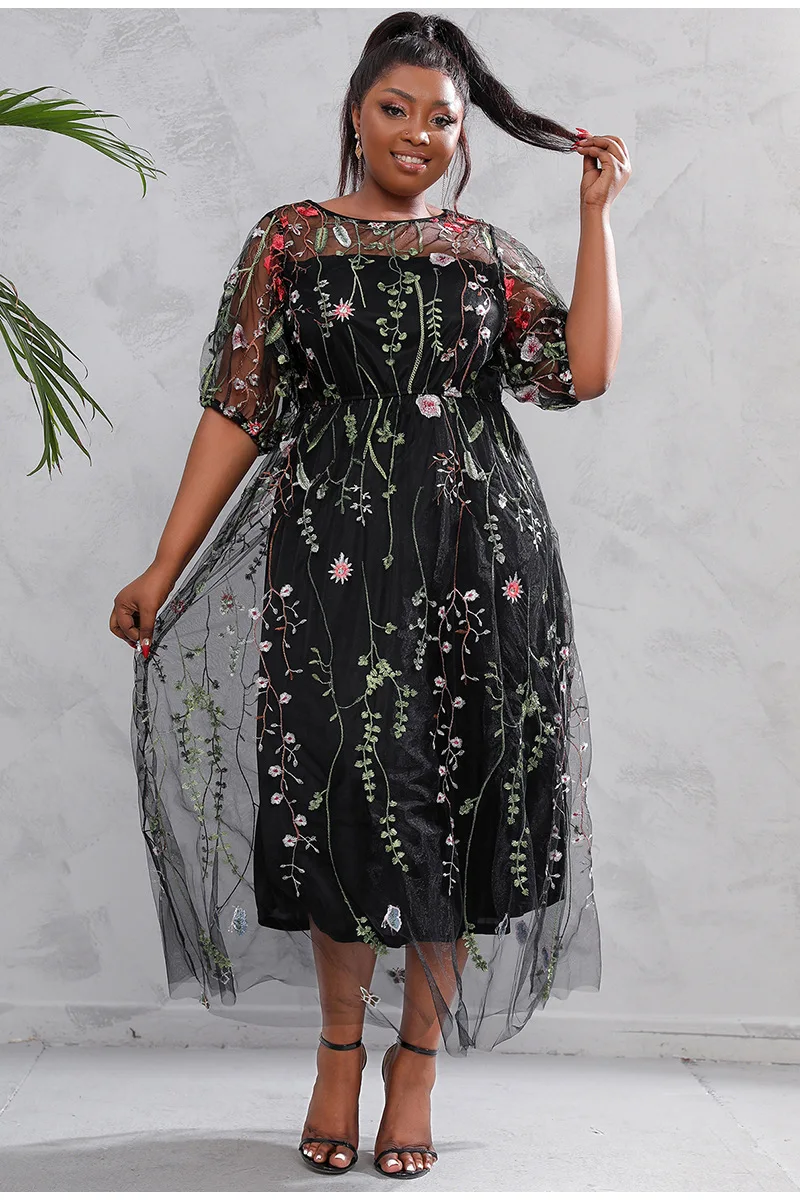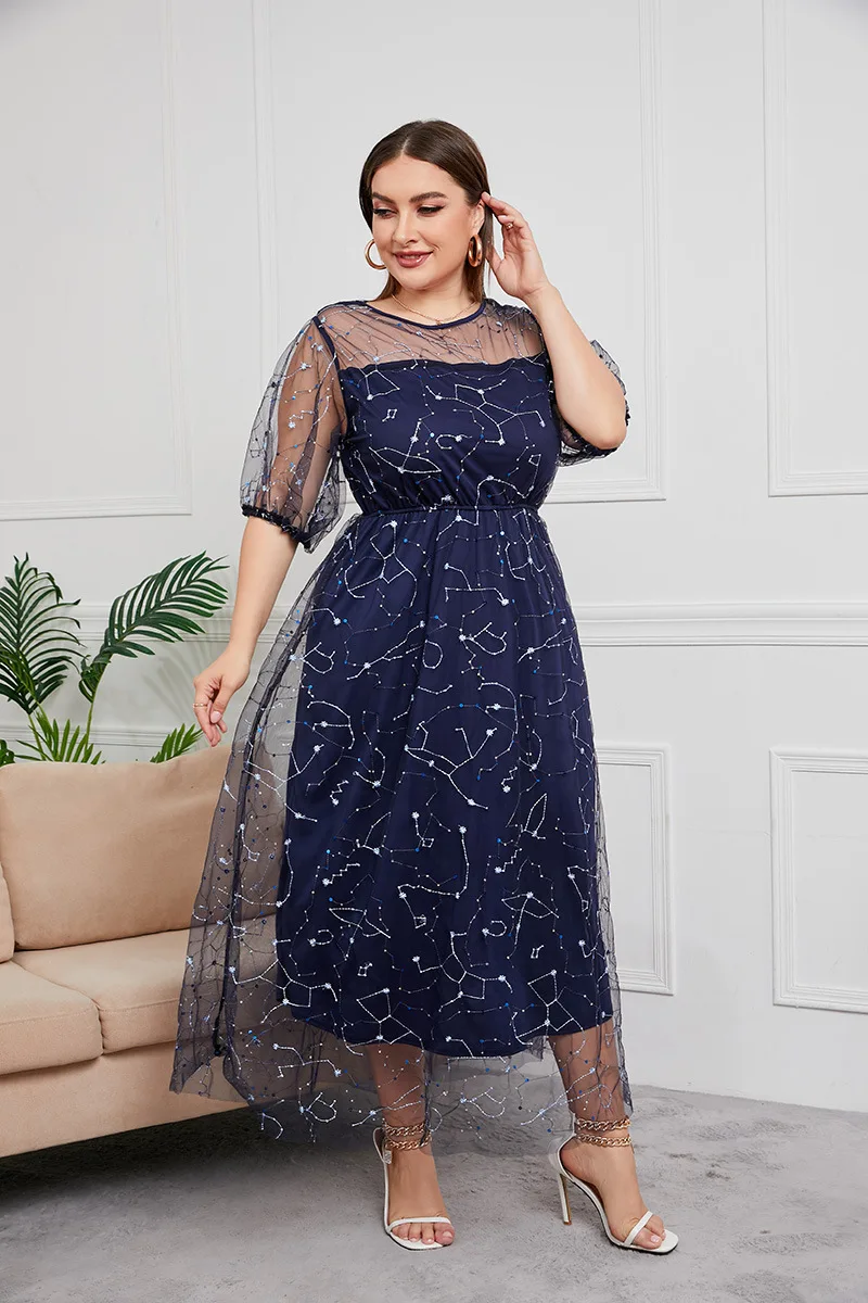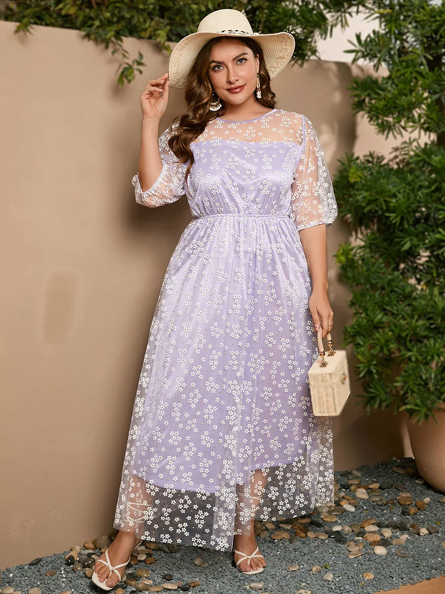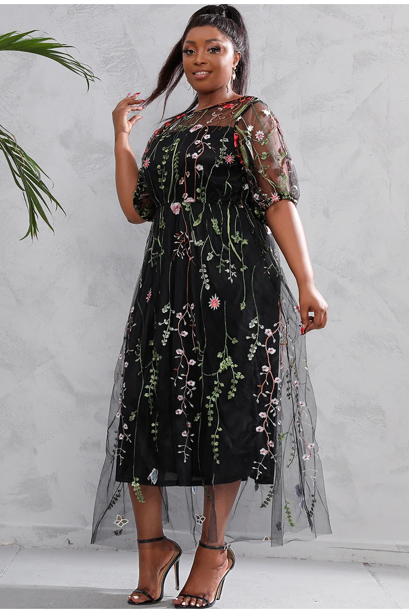 Vigojany 2025 Summer Mesh Patchwork Plus Size Dress Women O Neck Short Sleeve Large Big Dress Casual Lady Chubby Curvy Dresses