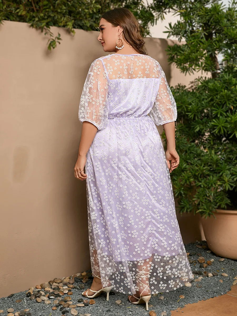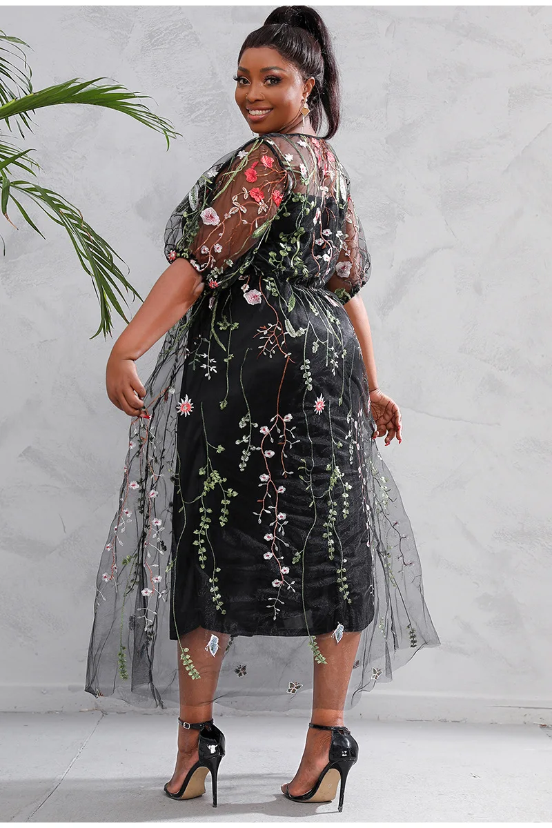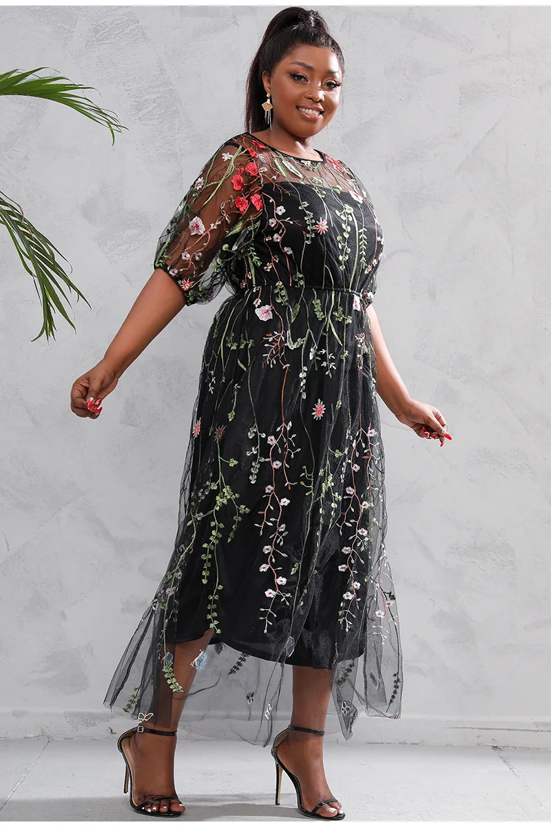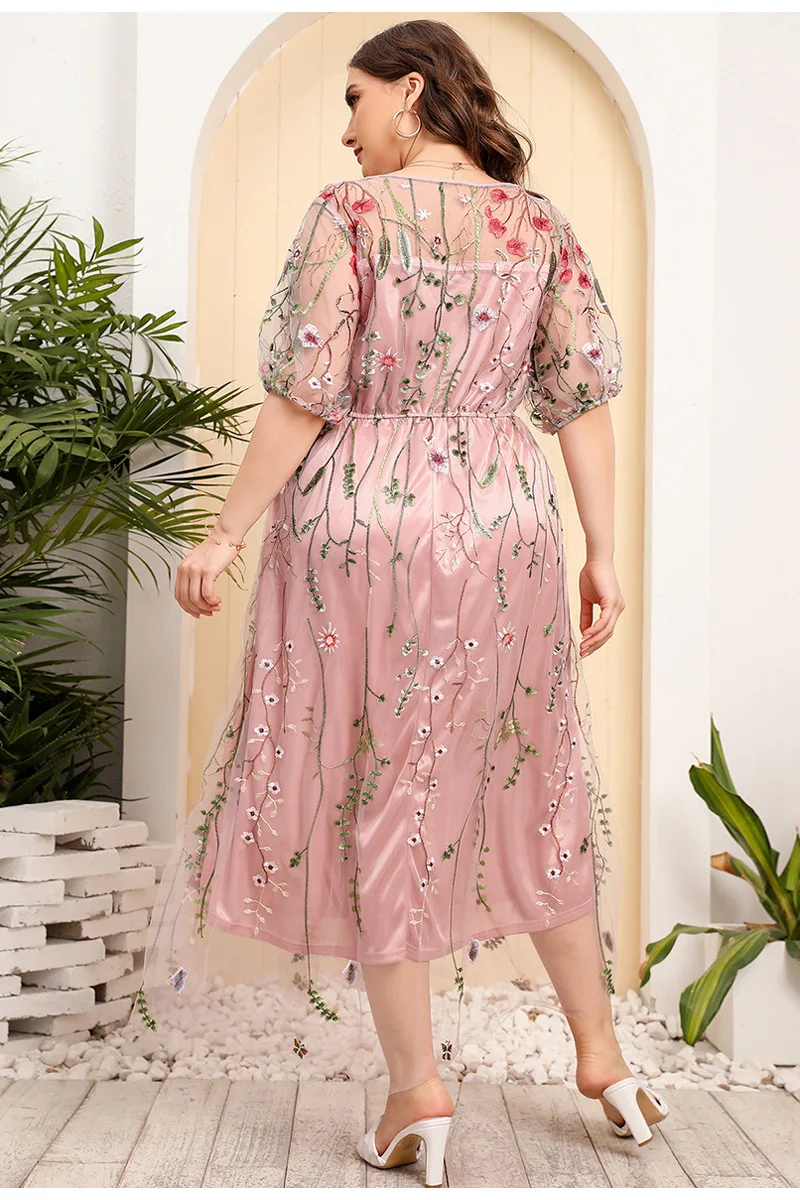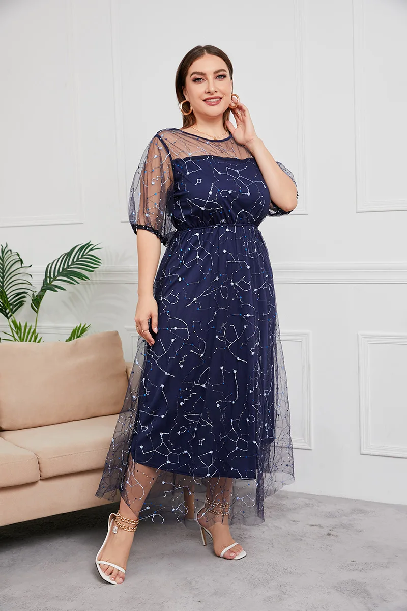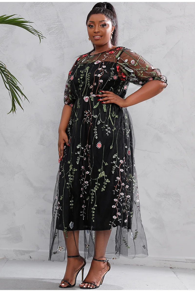 Vigojany 2025 Summer Mesh Patchwork Plus Size Dress Women O Neck Short Sleeve Large Big Dress Casual Lady Chubby Curvy Dresses