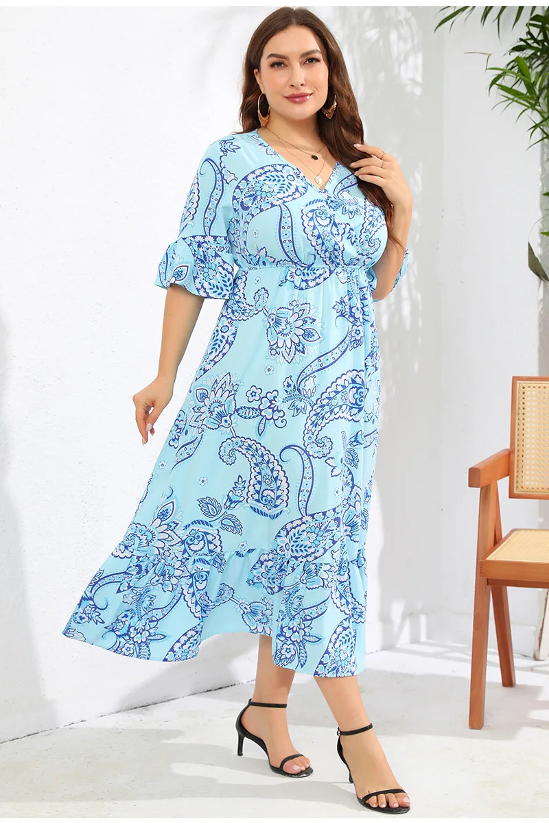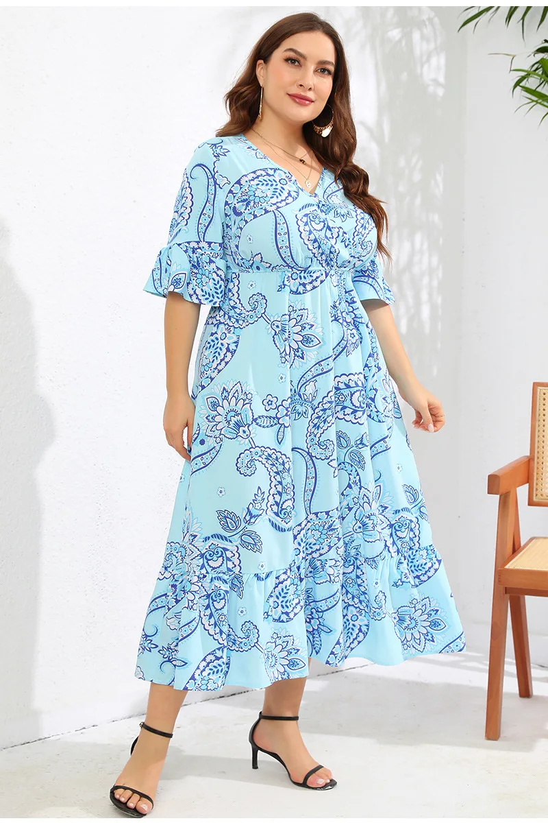 Vigojany 2025 Women Summer Short Sleeve Plus Size Dress Print Casual V Neck Large Big Dress Lady Chubby Curvy Long Dresses