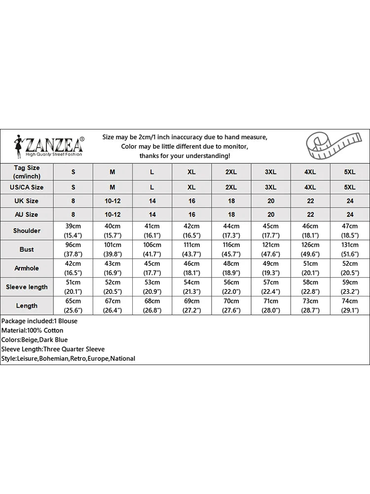 | Package included:1 Blouse Material:100% Cotton Colors:Beige,Dark Blue Sleeve Length:Three Quarter Sleeve Neckline:O-Neck Pattern:Floral Embroidery Thickness:Thin Features:Puff Sleeve Style:Leisure,Bohemian,Retro,Europe,National Season:Spring,Summer,Autumn Occasion:Family,Party,Beach,Wedding,Holiday,Employment Label: Yes Attentions: 1.The Real Object May Exist Slightly Colors Differences Compared To Images As Different Computers Display.Caution If Minding,Thanks. 2.There Might Be A Manual Measuring 1-3 cm Error.Sorry For Any Inconvenience. 3.Please Prevail On Real Item, Model Images For Reference Only. 4.Attention!!!Please check the size chart carefully before placing the order.