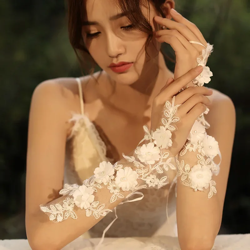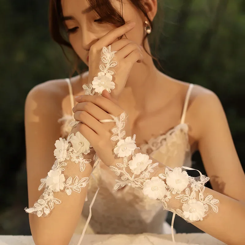 White Lace Short Bridal Gloves Fingerless Handmade Flowers Wedding Accessories Veu De Noiva