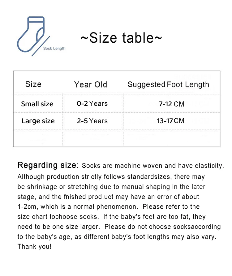 1. regarding size:socks are machine woven and have elasticity although production stritly follows standard sizes,there may be shrinkage or stretching due to manual shapong in the later stage and the finished product may have an error of about 1-2mm,which is a normal phenomenon ,if baobao is overweight or cares about the size ,you can choose a larger size thank you!
