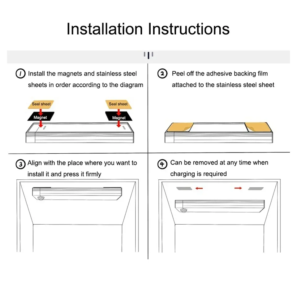 2. The install method is magnetic suction type. Tear off the adhesive on the back of the iron sheet and stick it on the wall or cabinet, and stick magnet strip onto the back of the lamp. The induction lamp can be sucked with the magnet and iron sheet.
