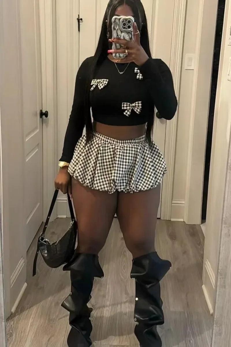 Women Fashion 2 Piece Set Bow Decor O-neck Long Sleeve T-shirts Crop Tops + Mini Plaid Puffy Shorts Skirts Casual Street Suits