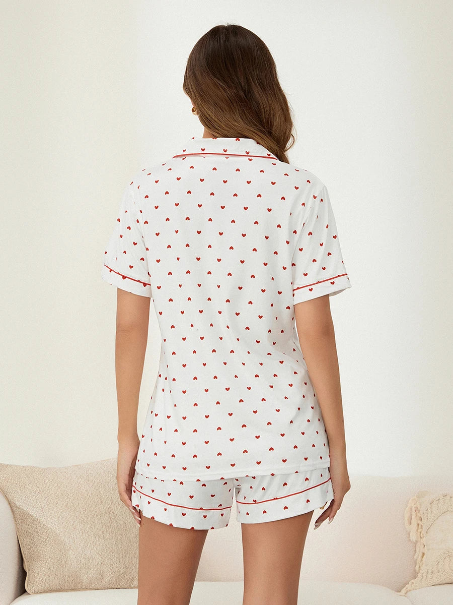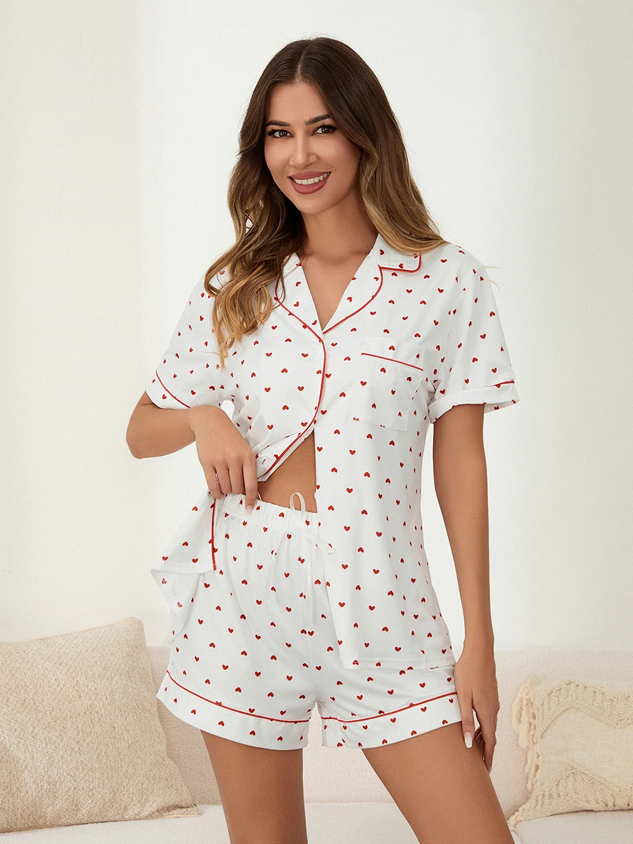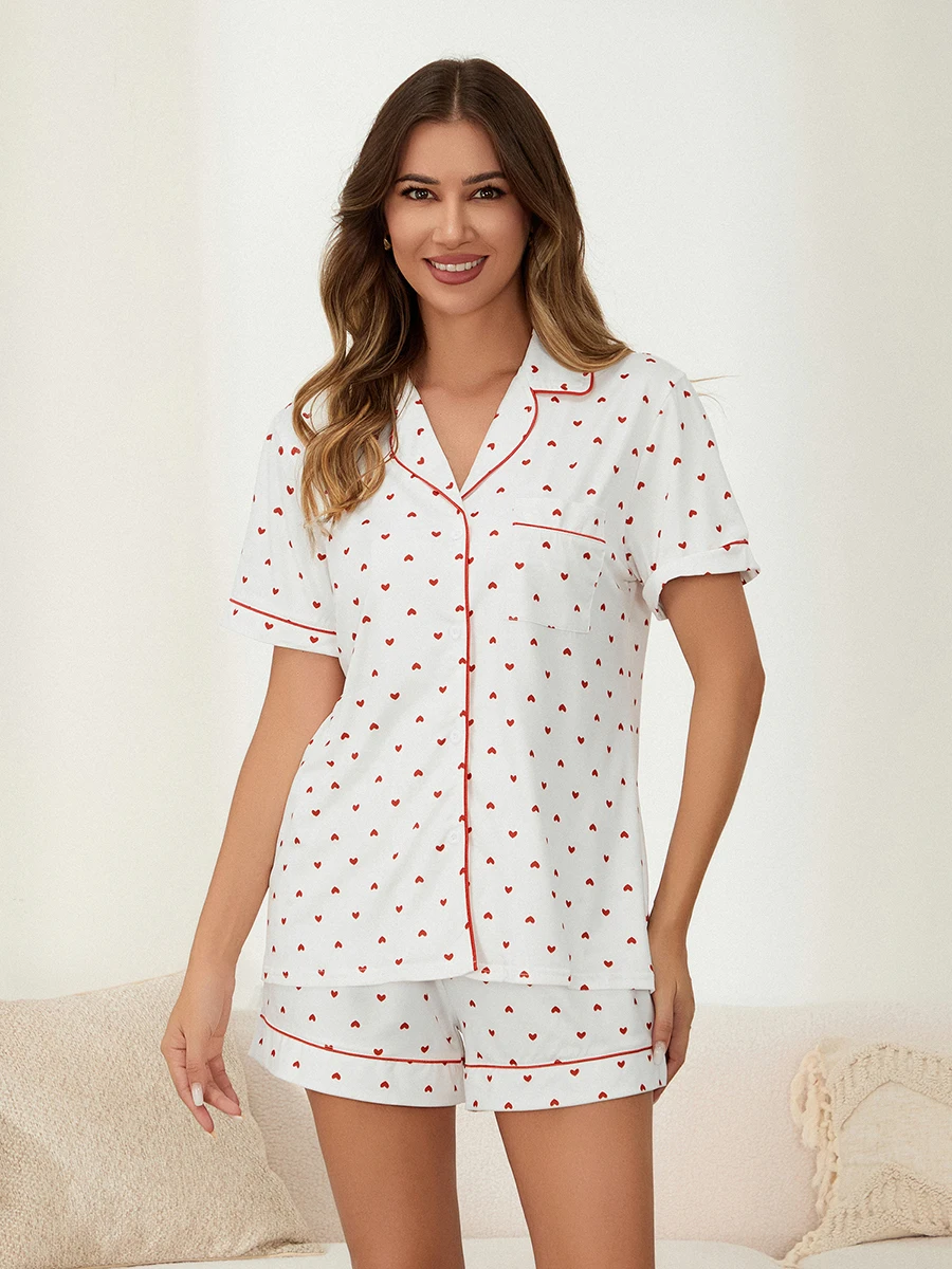 Women Pajamas Set 2 Pieces Loungewear Suits Heart Print Short Sleeve Loose Shirts Tops and Shorts Sleepwear Outfits