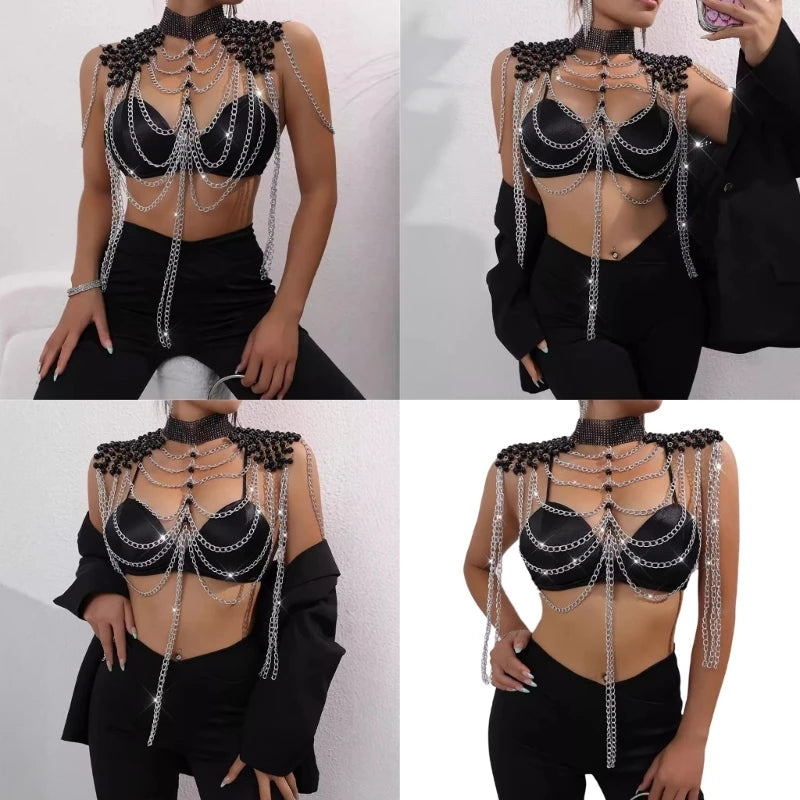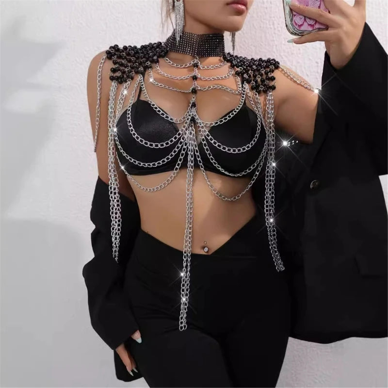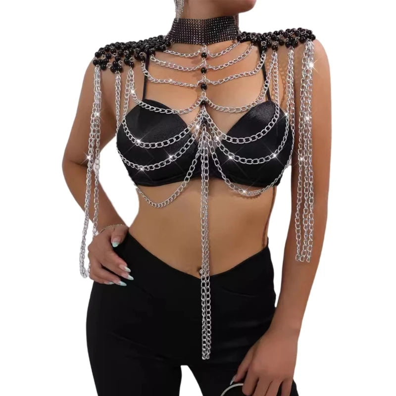 Women Pearls Beaded Shoulder Chain Necklace Layered Metal Chain Tassels Body Jewelry Shawl Camisole Top Body Accessory