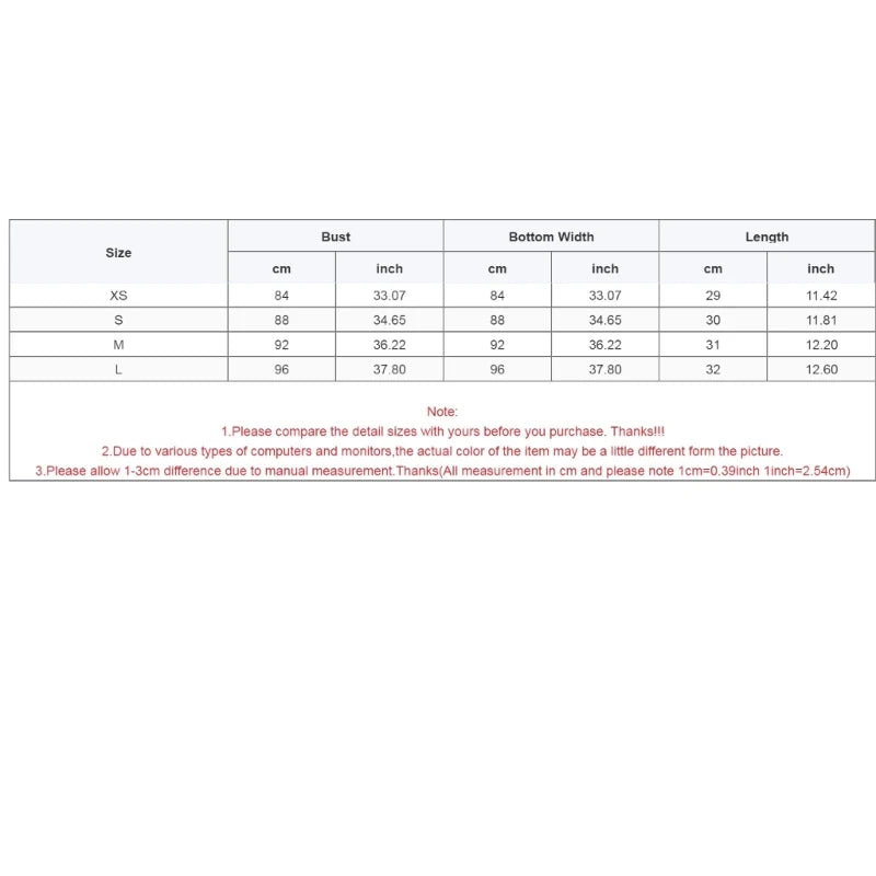 Size:S Bust:88cm(34.65inch) Bottom Width:88cm(34.65inch) Length:30cm(11.81inch)