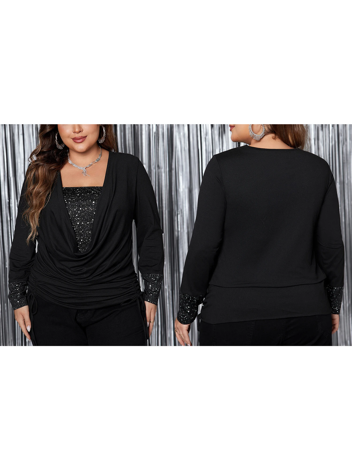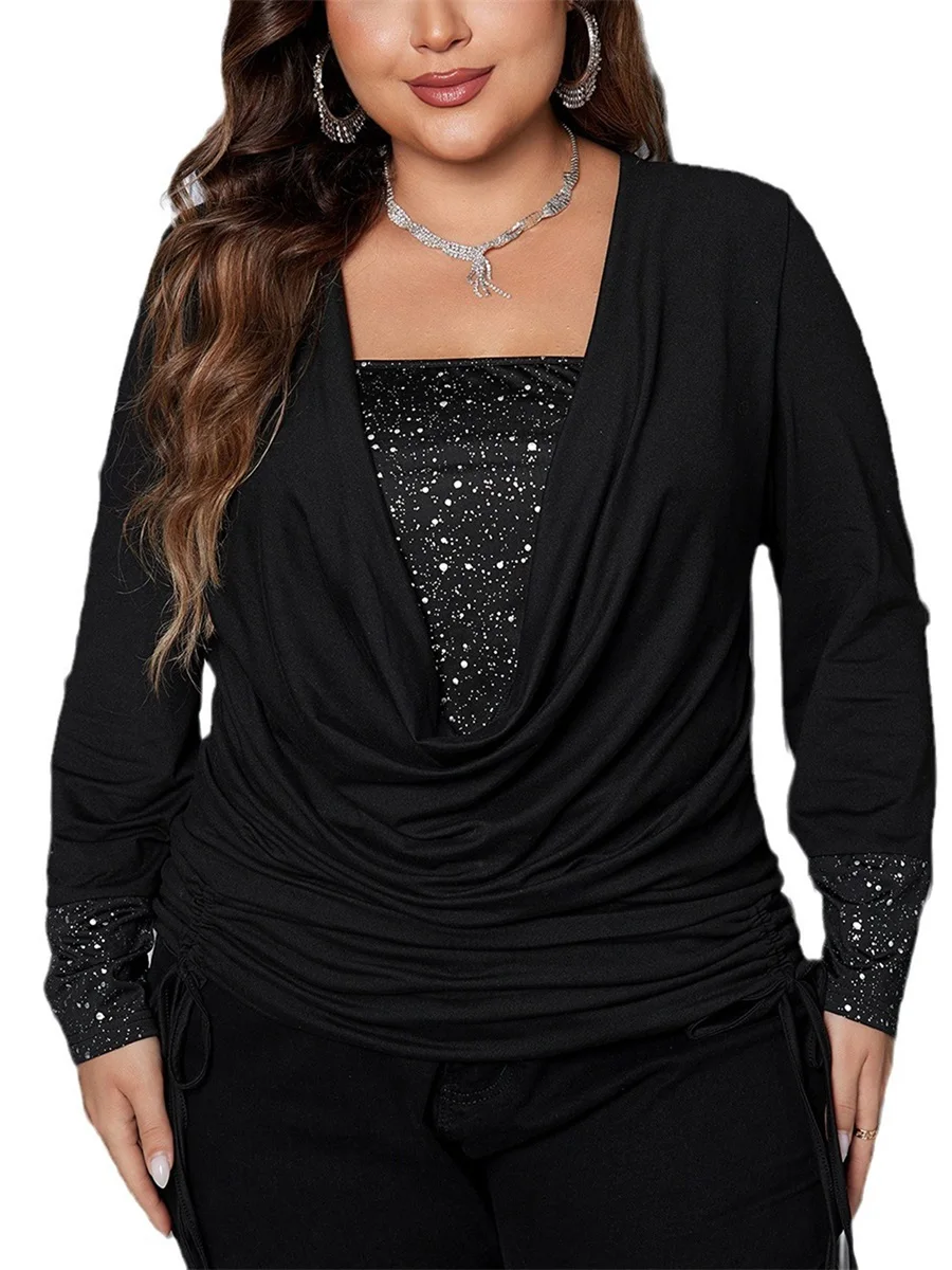 Women Plus Size T-Shirts Glitter Drop Collar Long Sleeve Drawstring Fake Two-Pieces Loose Shirts Spring Fall Casual Tops