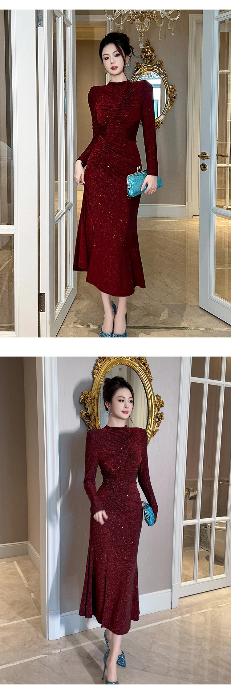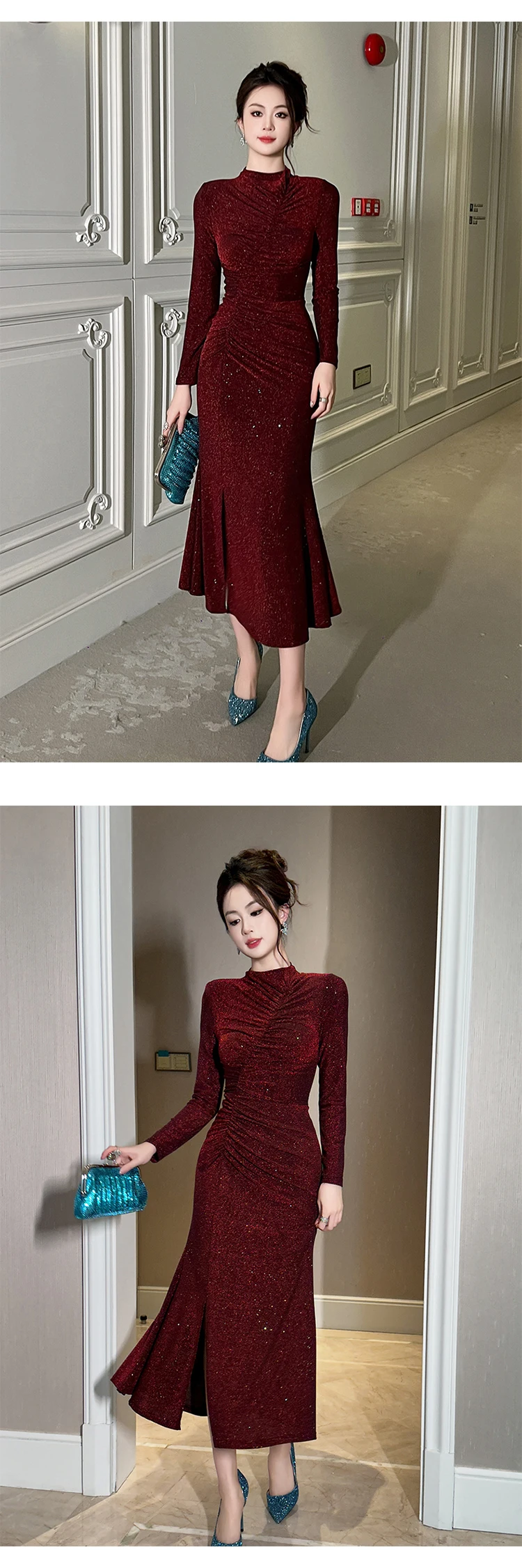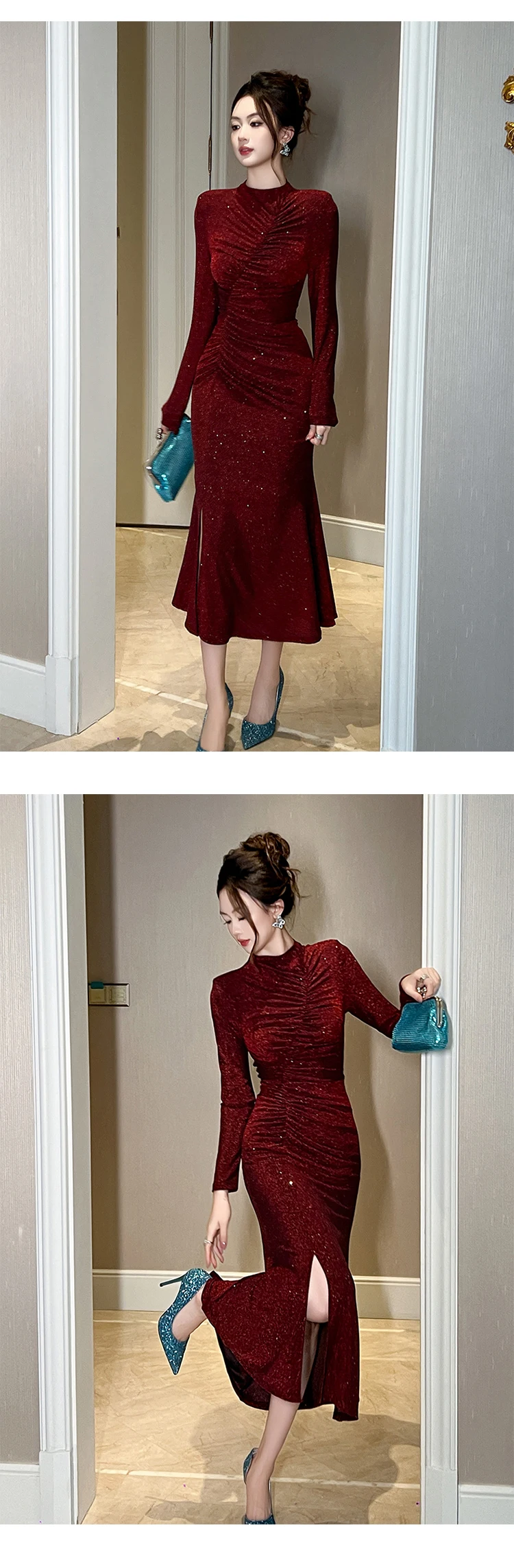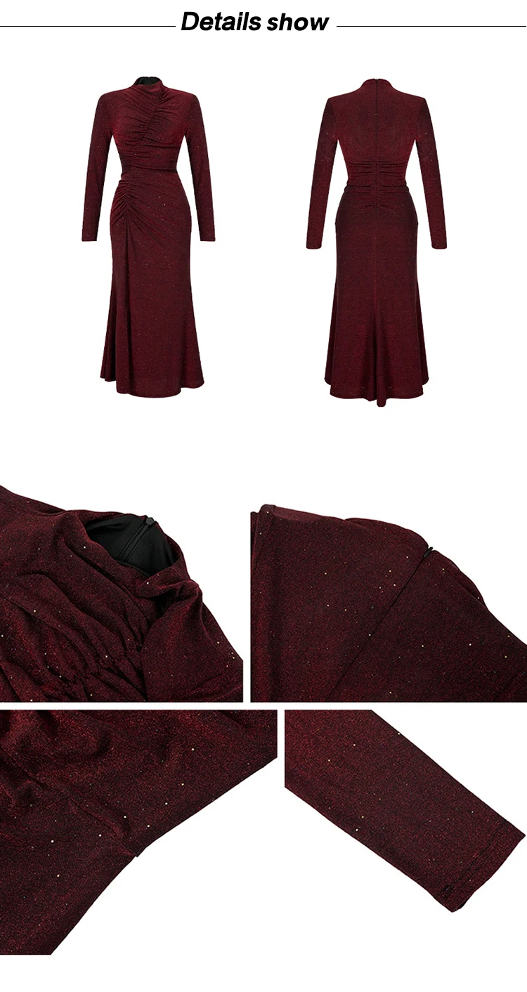 Women‘s Fashion Elegant Birthday Party Dress Female Clothing Glitter Bright Sequin Slit Folds Fishtail Robe Evening Prom Vestido
