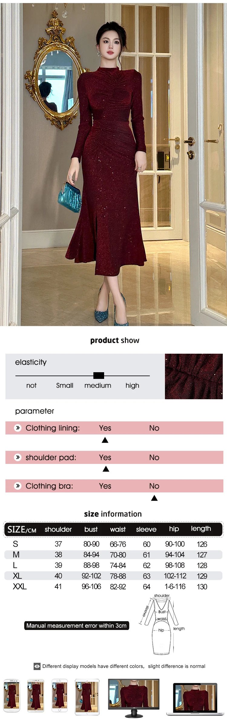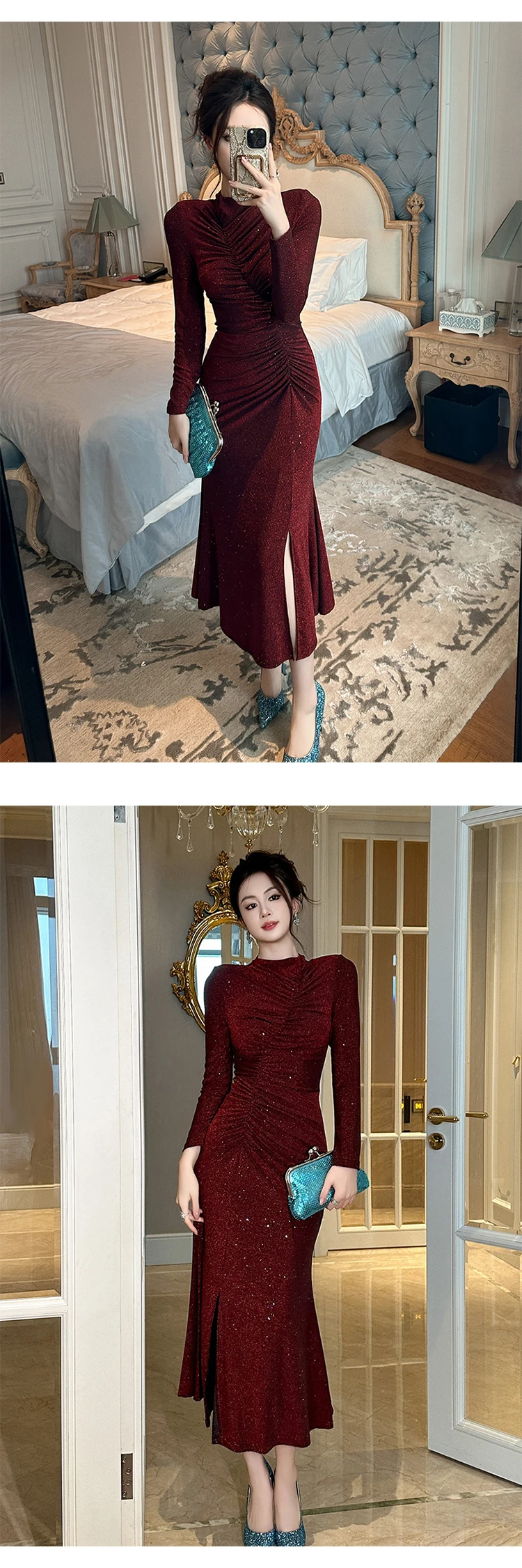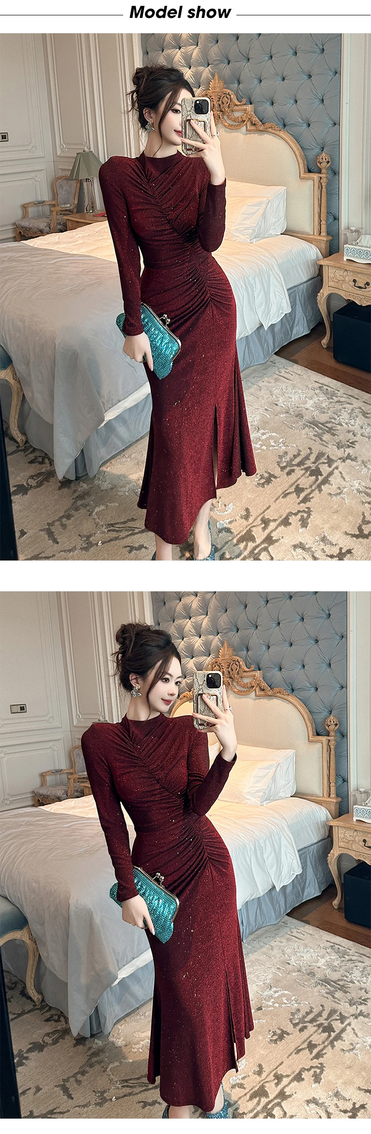 Women‘s Fashion Elegant Birthday Party Dress Female Clothing Glitter Bright Sequin Slit Folds Fishtail Robe Evening Prom Vestido