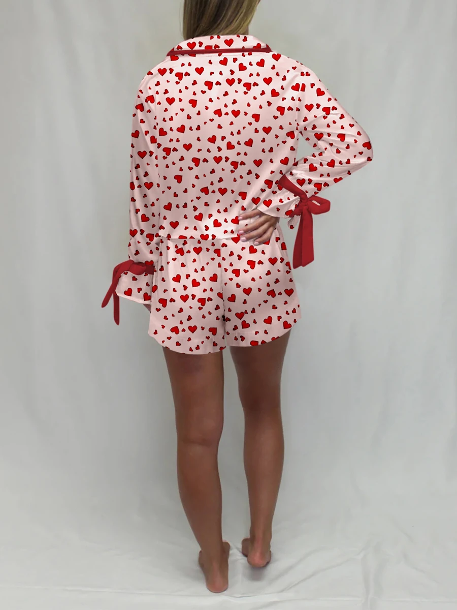 Women's Valentine's Day Lounge Set Long Sleeve Heart Print Shirt Drawstring Shorts Sleepwear