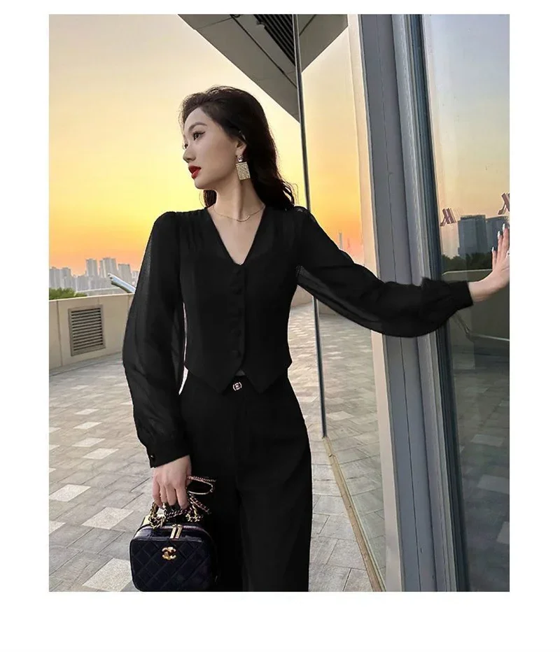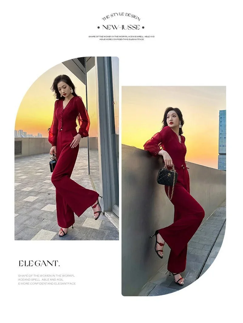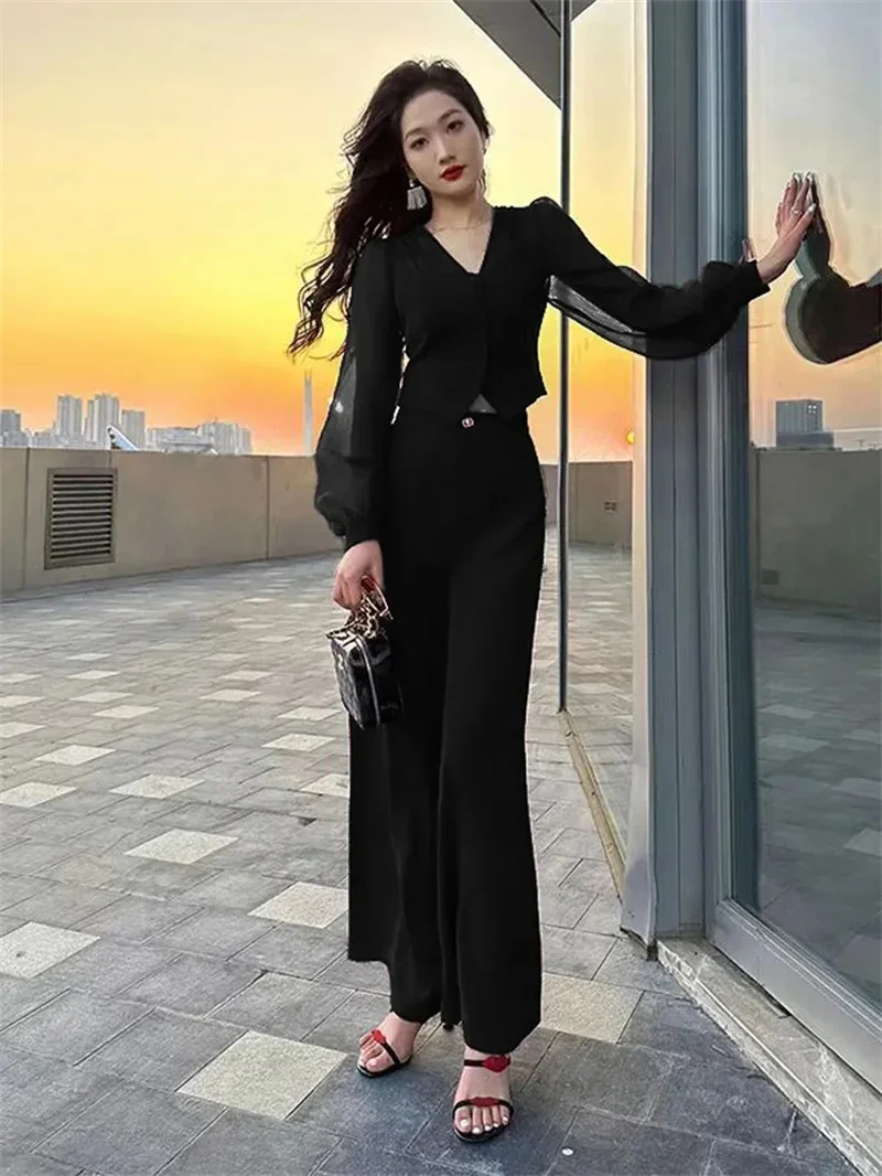 Women's Shirt Lace Top Wide Leg Pants Two-Piece Set 2025 Summer Set Female Elegant Wine Red Black Fashion Ladies Spring Suits