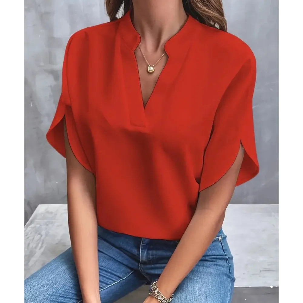 Women's solid color short sleeved top 2024 fashionable summer white casual temperament elegant style V-neck loose top for women