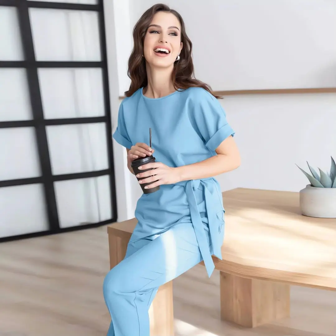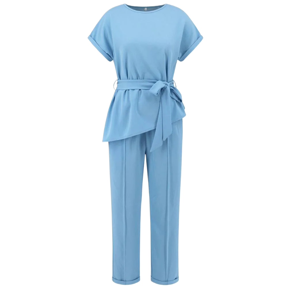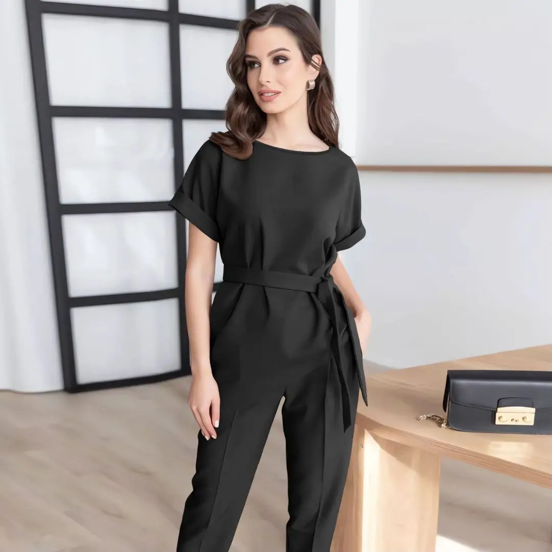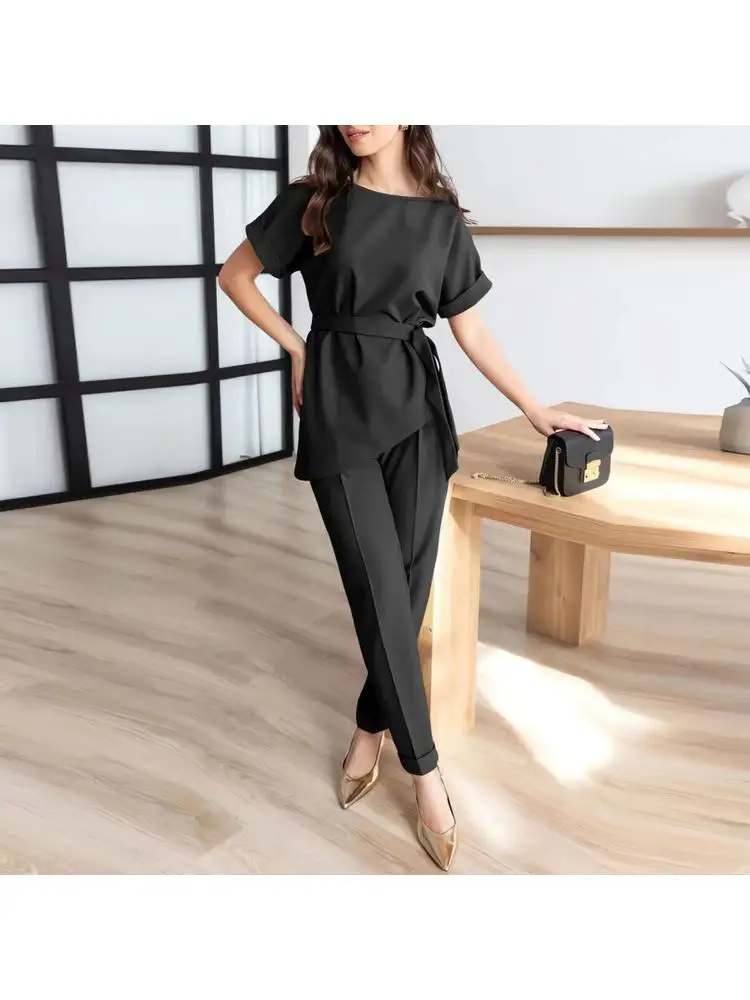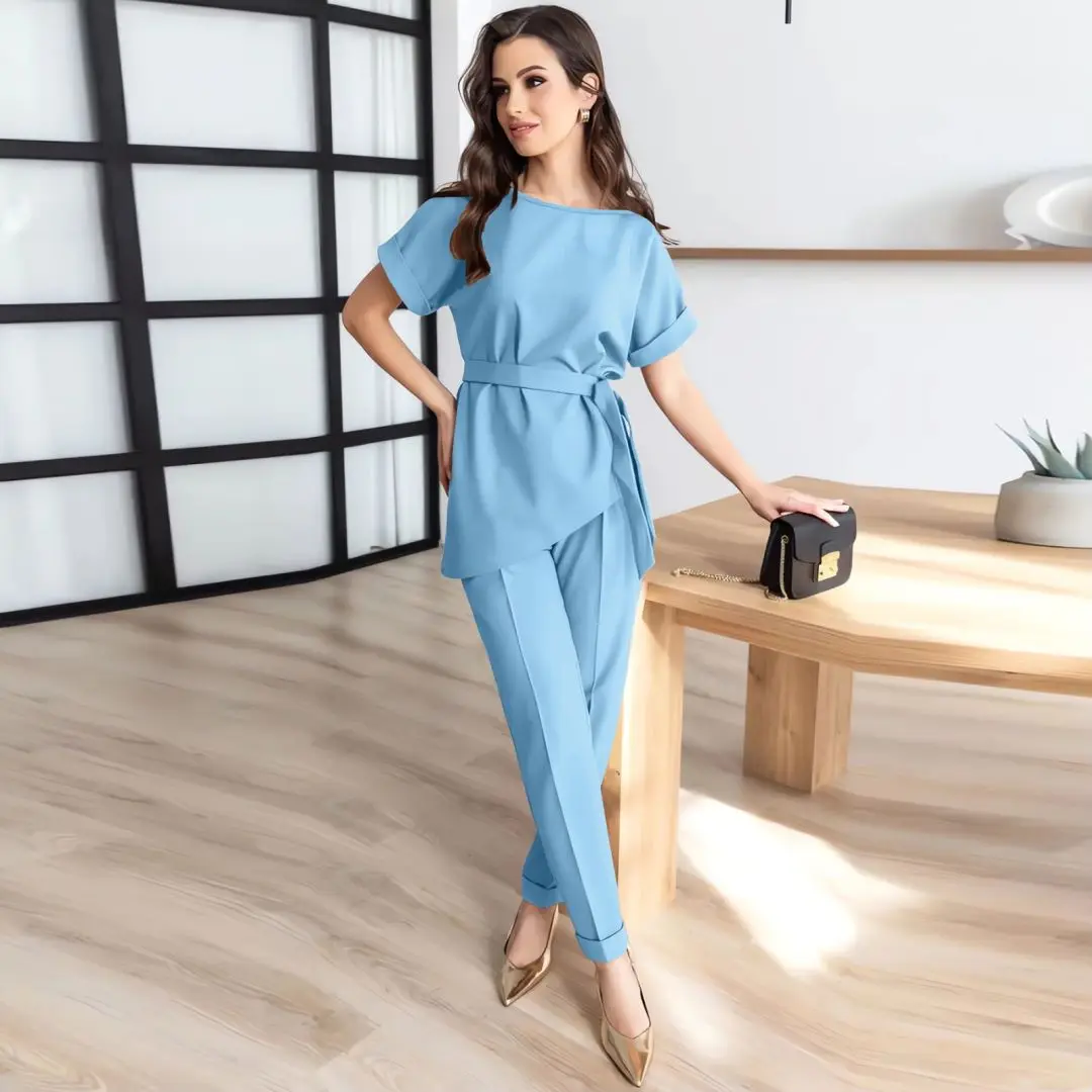 Women's Summer New Fashion Casual Round Neck Beveled Edge Suit Belt Top Set of Petite Pants Elegant Style Office Lady Suit Sets clothes