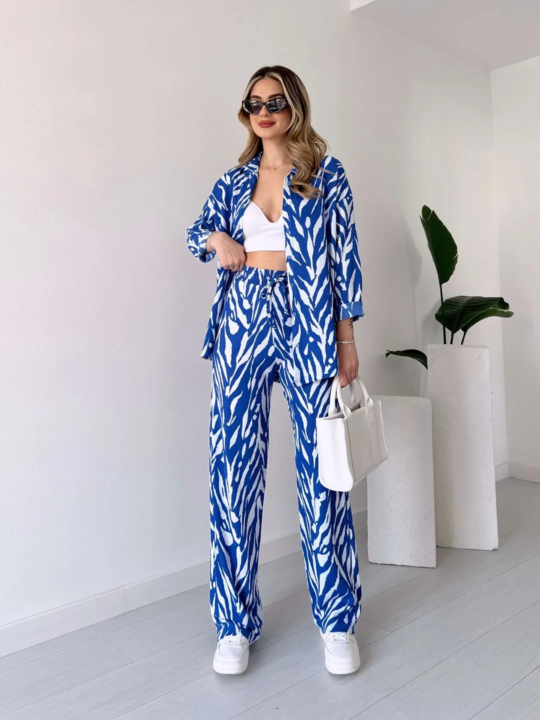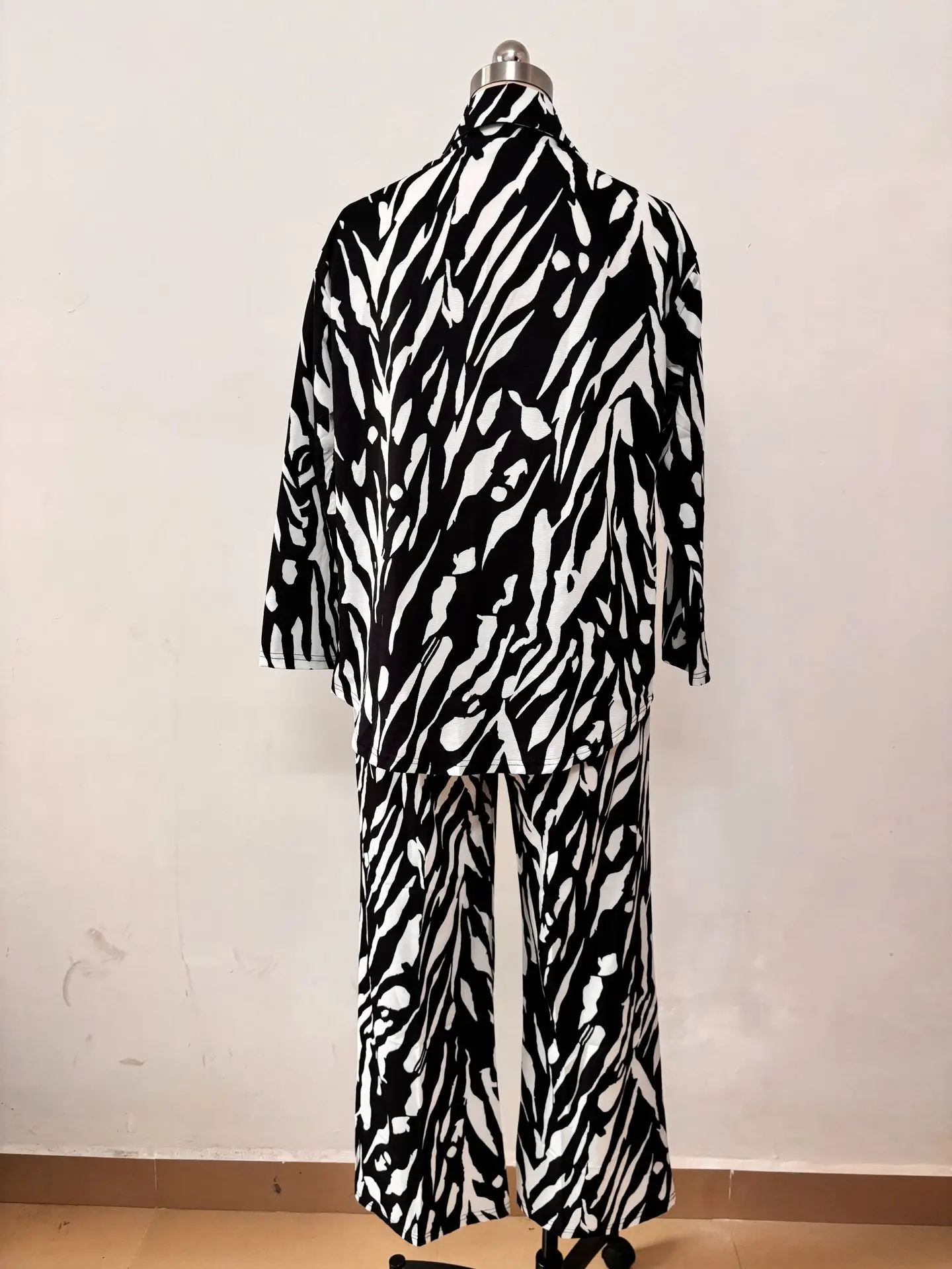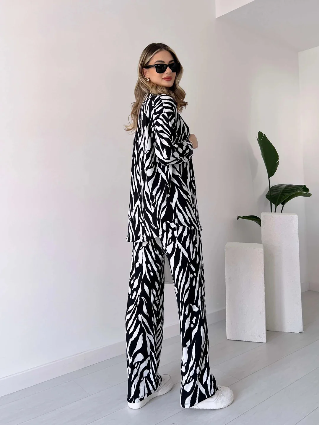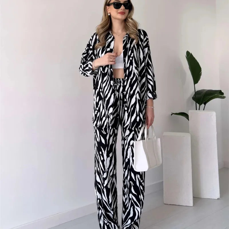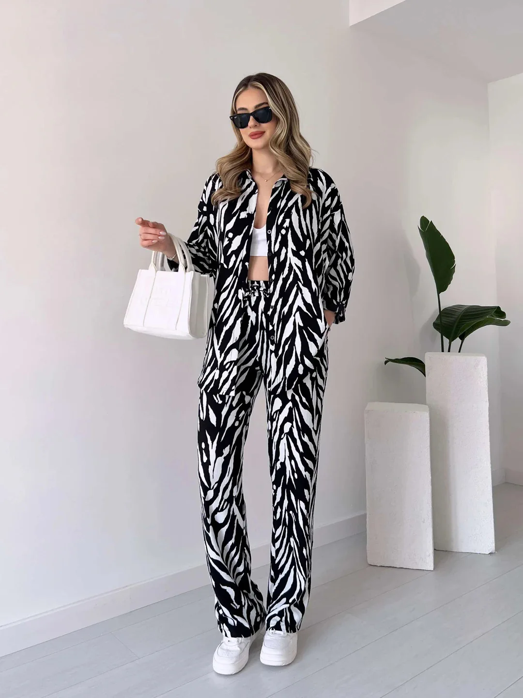 Women's Zebra Print 2-piece Set 2025 Spring Summer New Fashion Long Sleeve Shirt Top High Waist Wide Leg Pants Casual Outfits