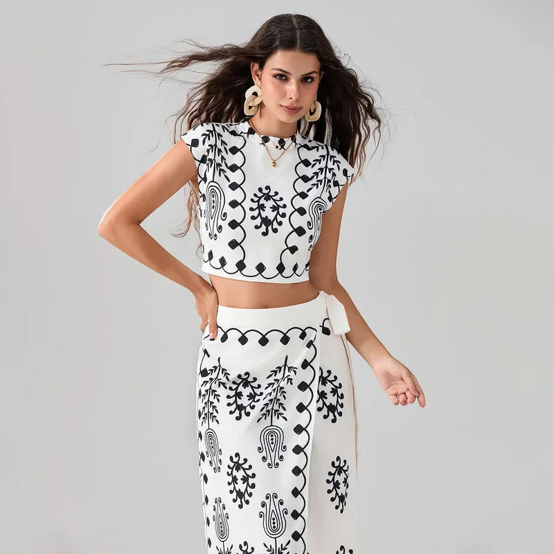 WPNAKS Women Elegant 2 Piece Skirt Sets Office Ladies Summer Clothes Chic Short Sleeve Boho Pattern Tops Long Skinny Skirt