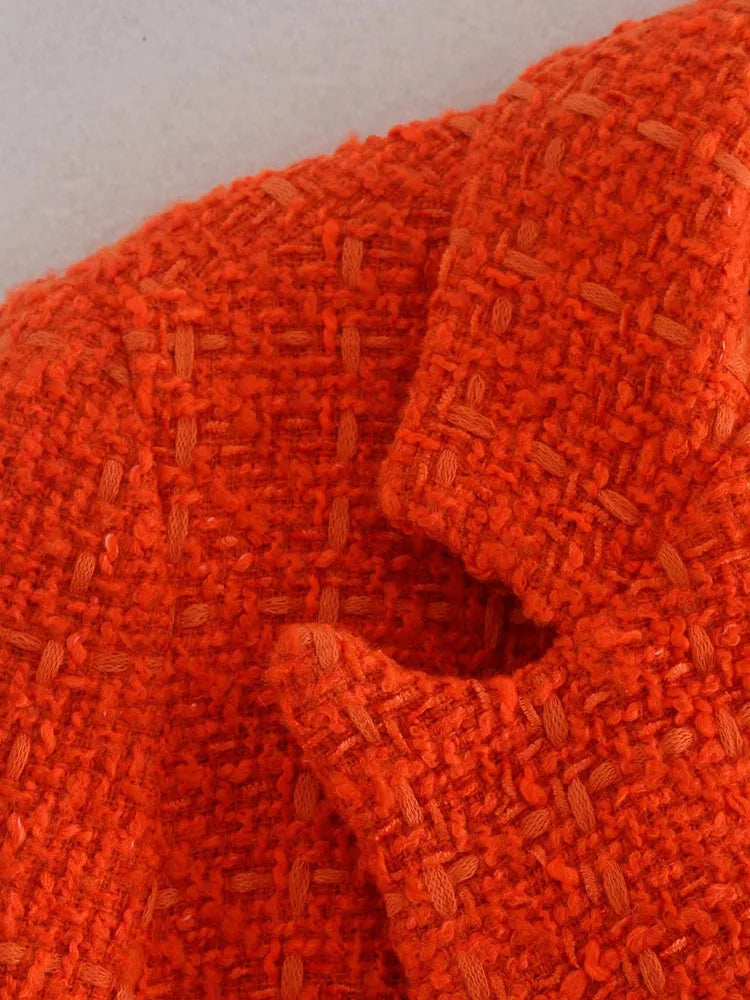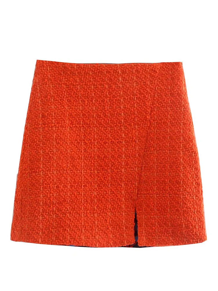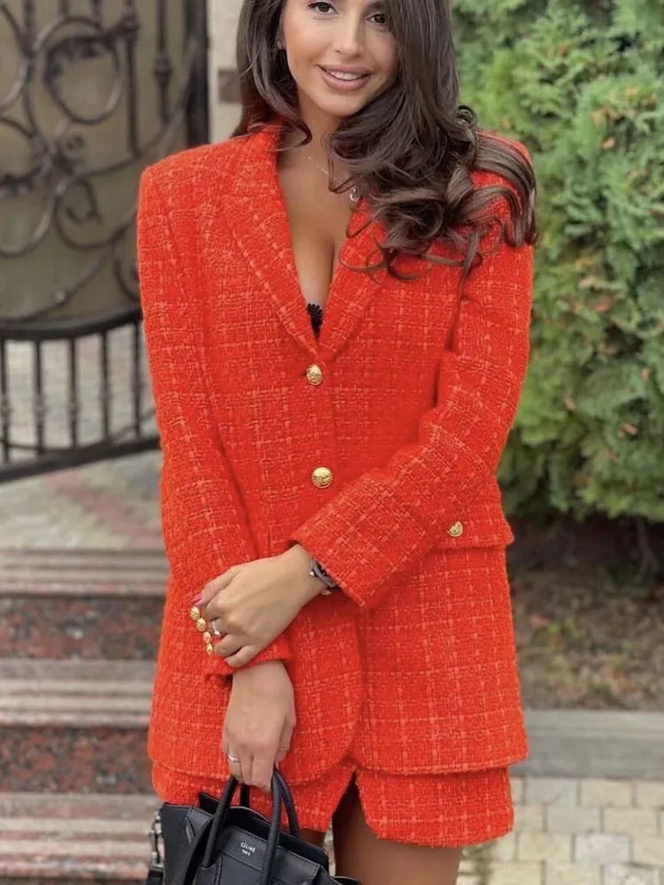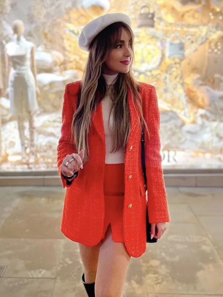 XEASY Women Tweed Red Retro Suit 2022 Spring Fashion Casual Office Slim Blazer Ladies High Waist Skirt Slit 2 Piece Set