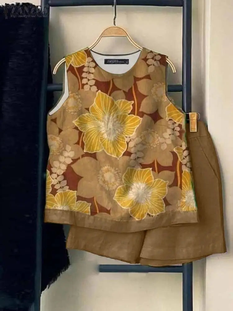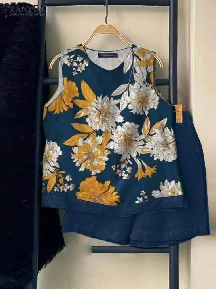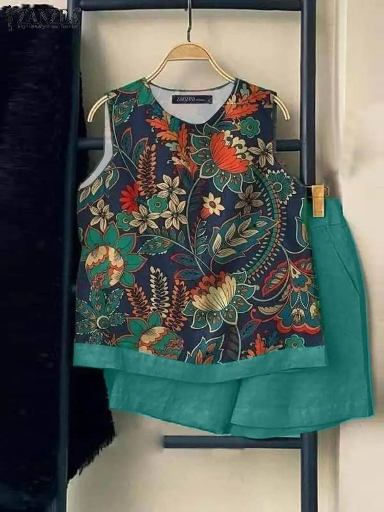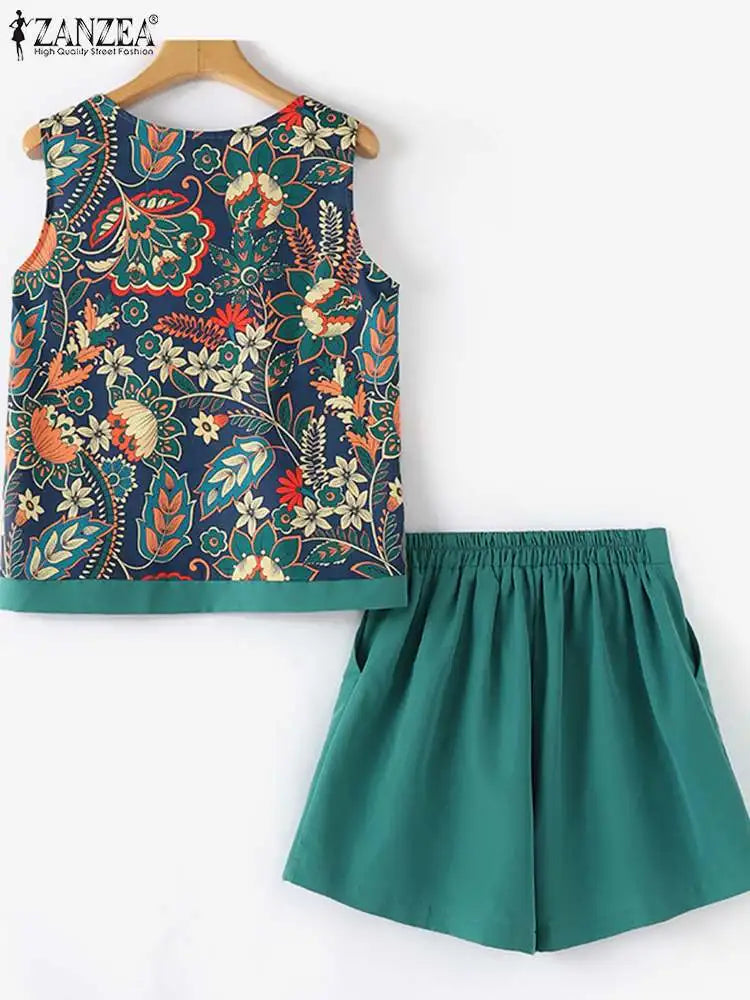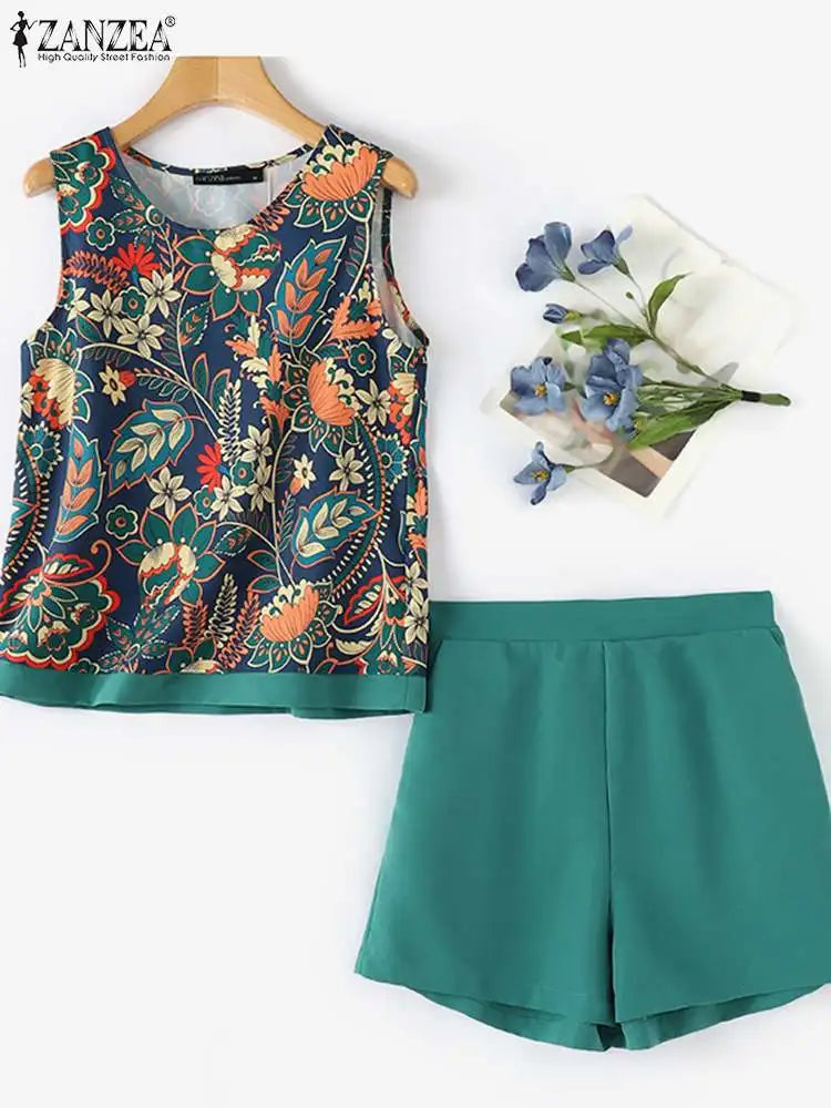 ZANZEA Elegant Floral Print Tank Top Short Sets Women 2024 Summer Elastic Waist Shorts 2pcs Outfits Holiday Casual Loose Suits
