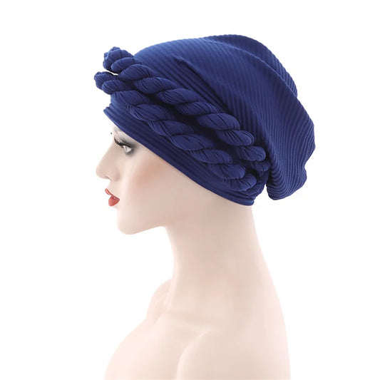 Solid Color Double Braids Turban Cap Women Rippled Muslim Headwear Braid Hat Islamic Female Head Wrap Bonnet Turbante Mujer