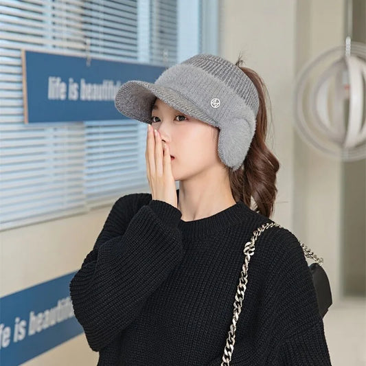 Autumn Winter Hollow Top Knitted Woolen Bomber Hat Ear Protection Thickened Warm Women's Fashion Baseball Hat Knitted Woolen Cap
