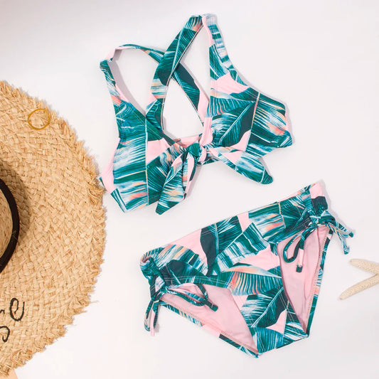 Tropical Print One-piece Swimsuit Bikini Set Ring-Linked Criss Cross Straps Backless Women Swimwear