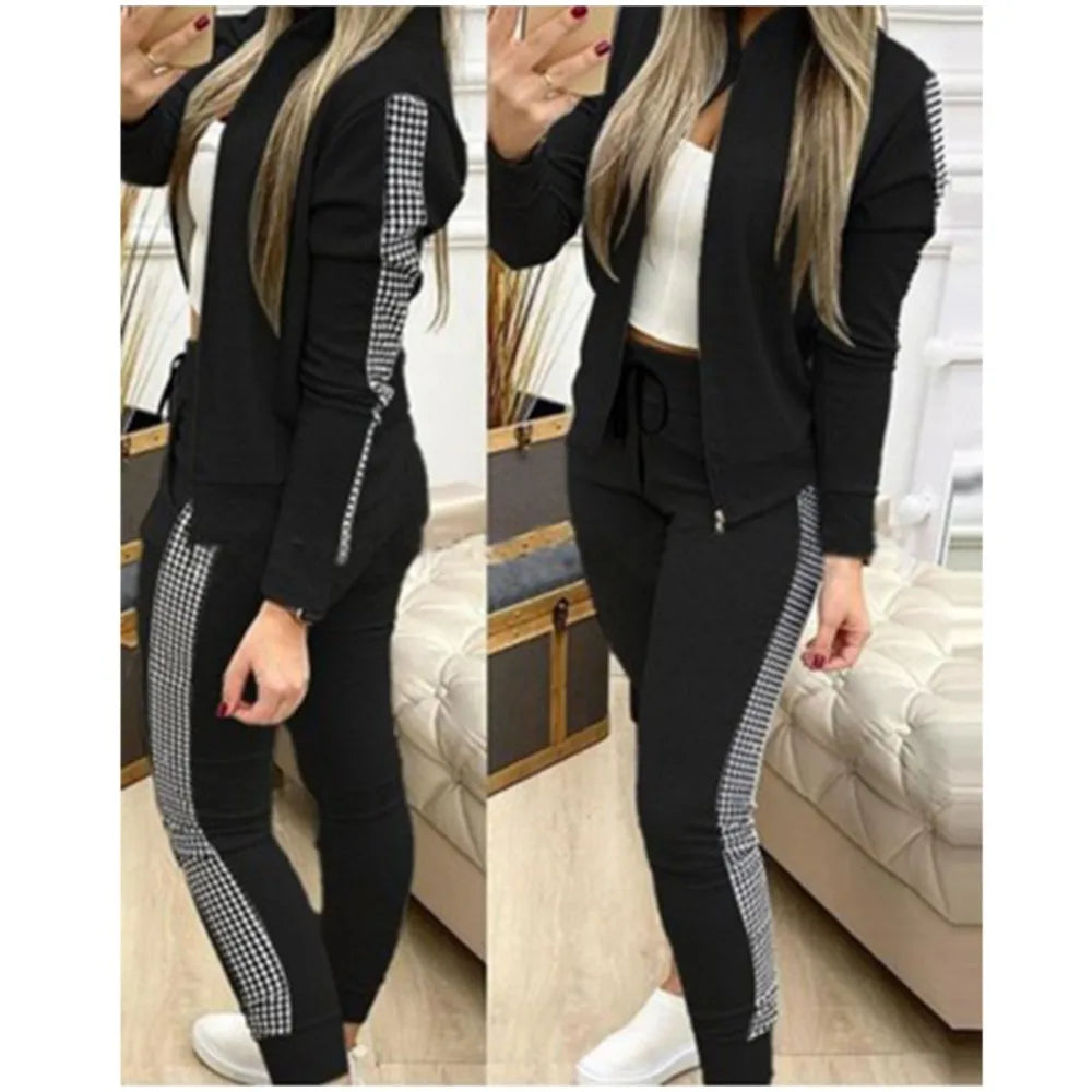 Athleisure Zipper Jacket Women's Suit Spring Fashion Patchwork Plaid Slim Fit Timid Feet Trousers Female 2 Piece Set 2025