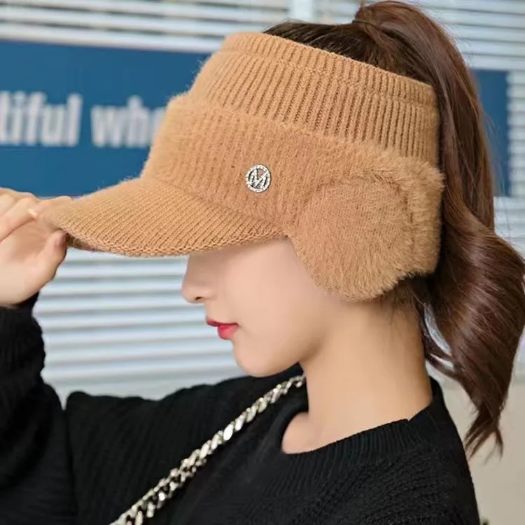 Autumn Winter Hollow Top Knitted Woolen Bomber Hat Ear Protection Thickened Warm Women's Fashion Baseball Hat Knitted Woolen Cap