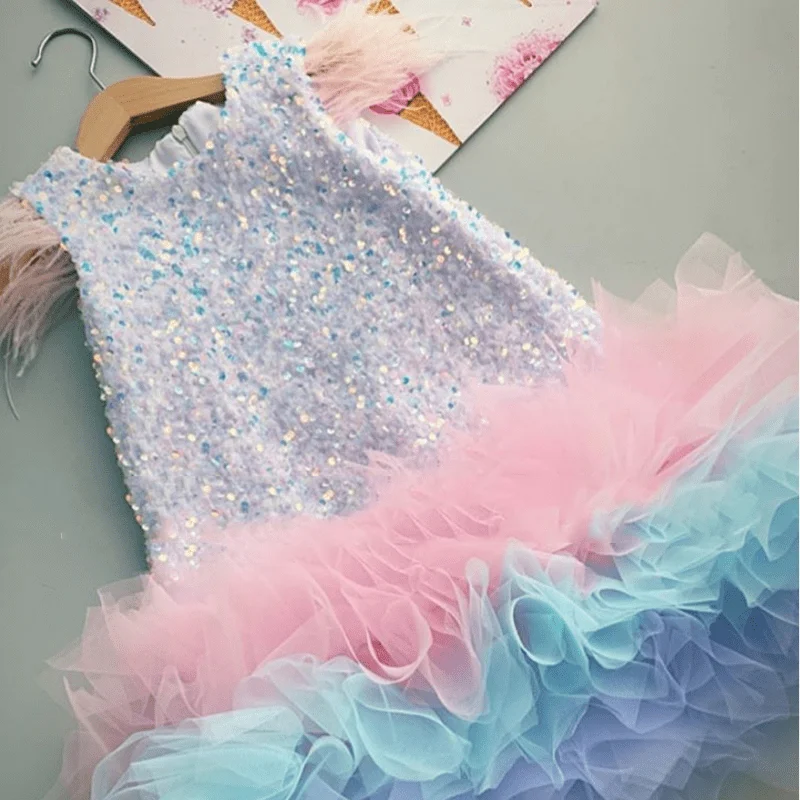 Baby Girl Princess Feather Sequin Dress Infant Toddler Child Teens Rainbow Vestido Party Pageant Birthday Baby Clothes 1-14Y