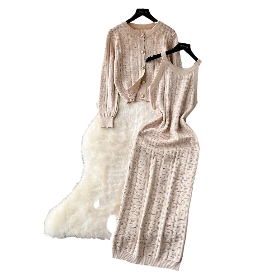 Knited Fall Winter Warm Women 2 Piecce Sets O-neck Single Breasted Cardigan Coats Tops Conjunto Korea Sleeveless Dresses Outfit