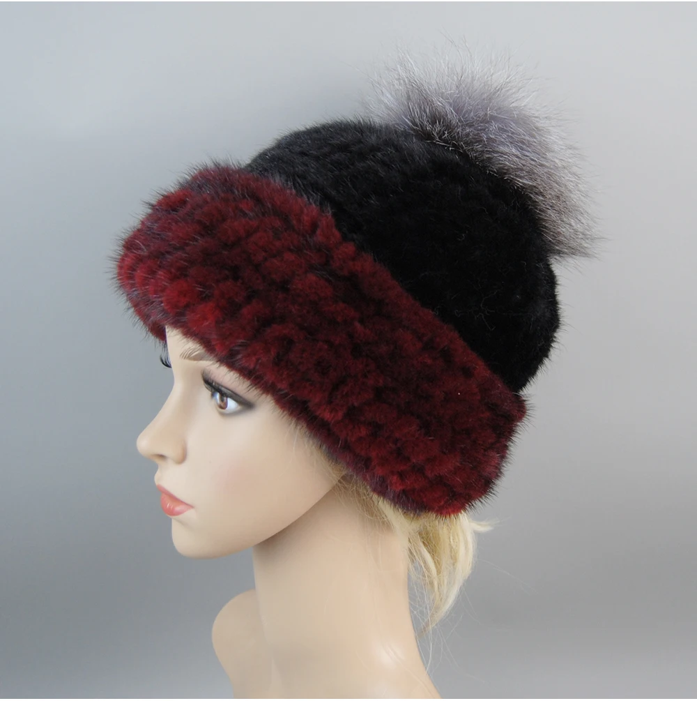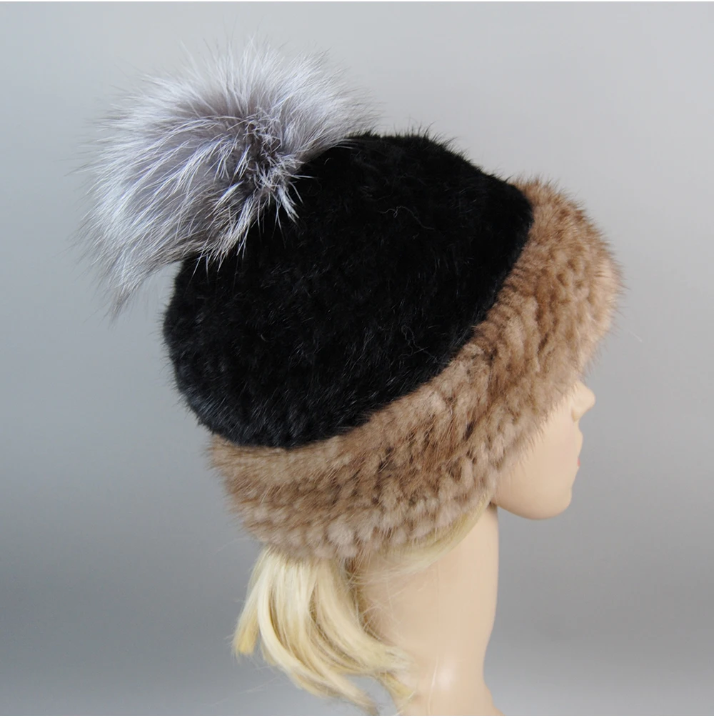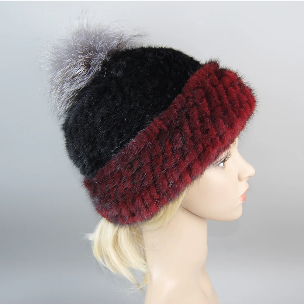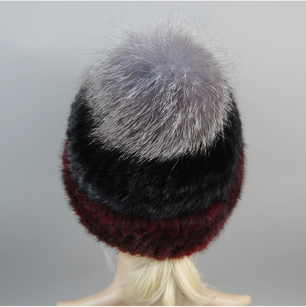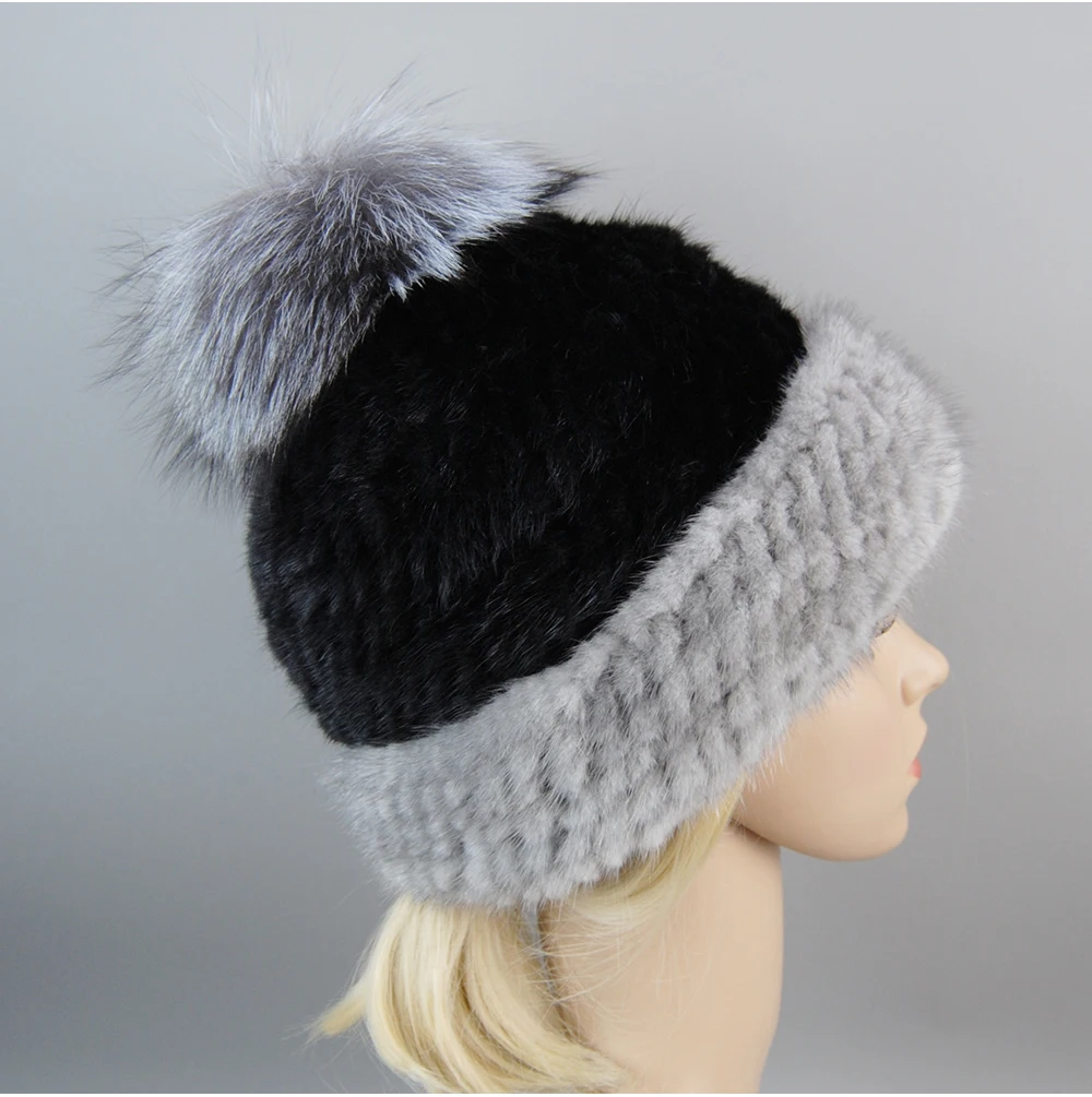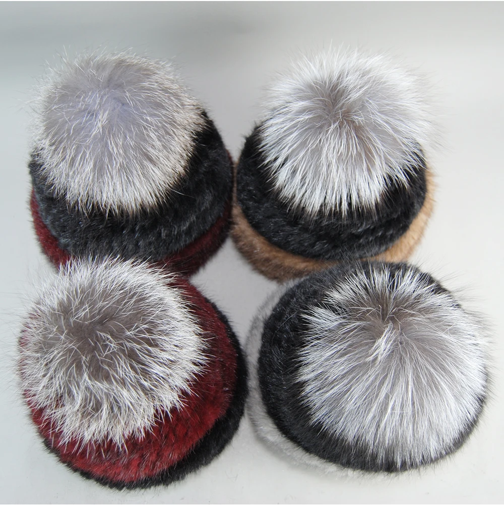 Real Mink Fur Hat For Winter Women Imported Knitted Mink Cap With Fox Fur New Hot Sale High Quality Women Beanies Hat