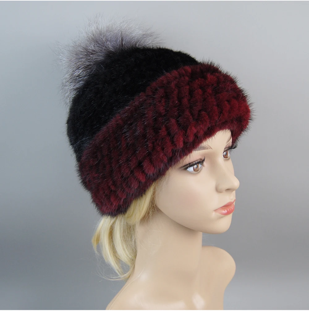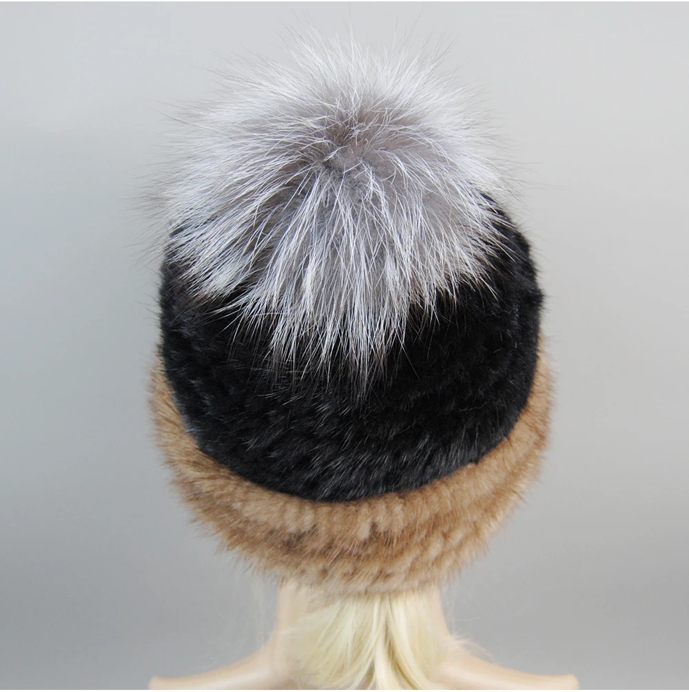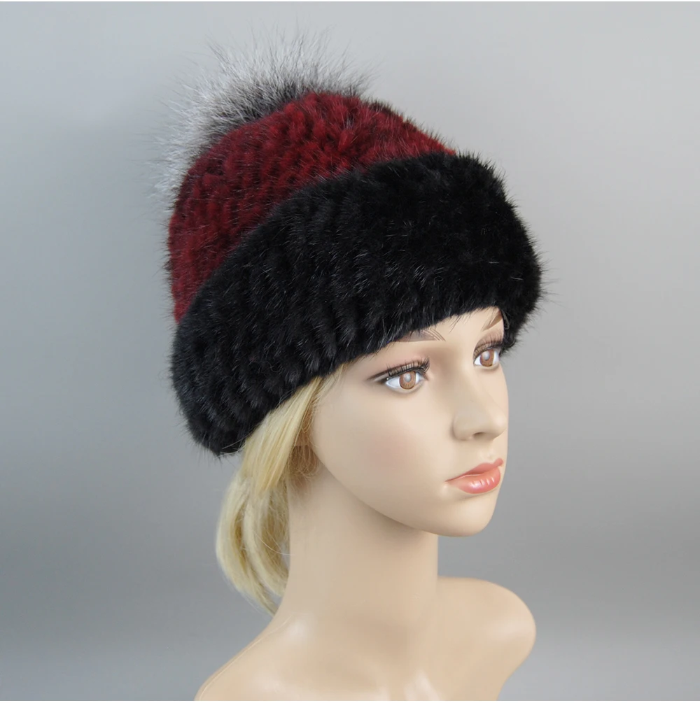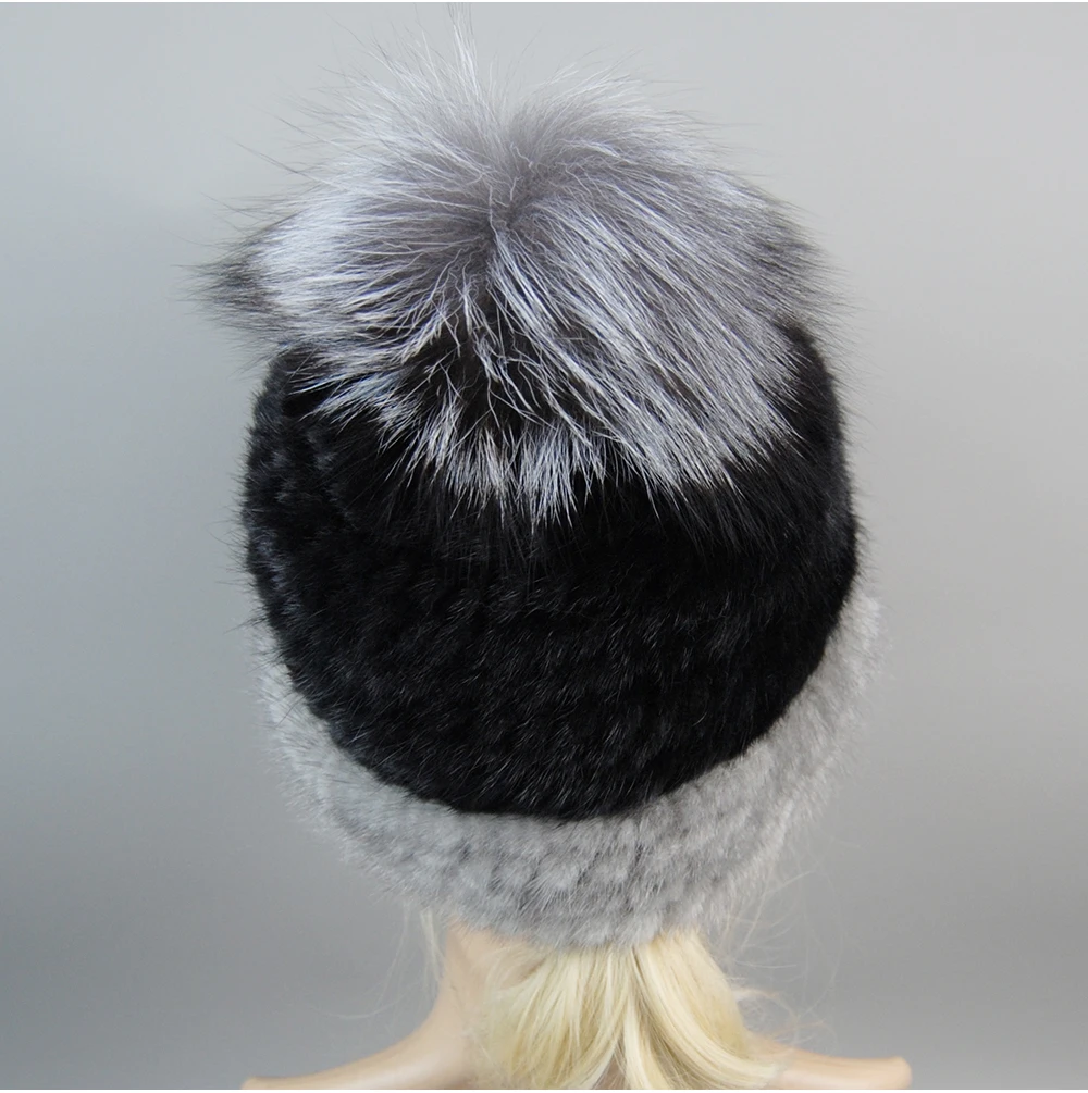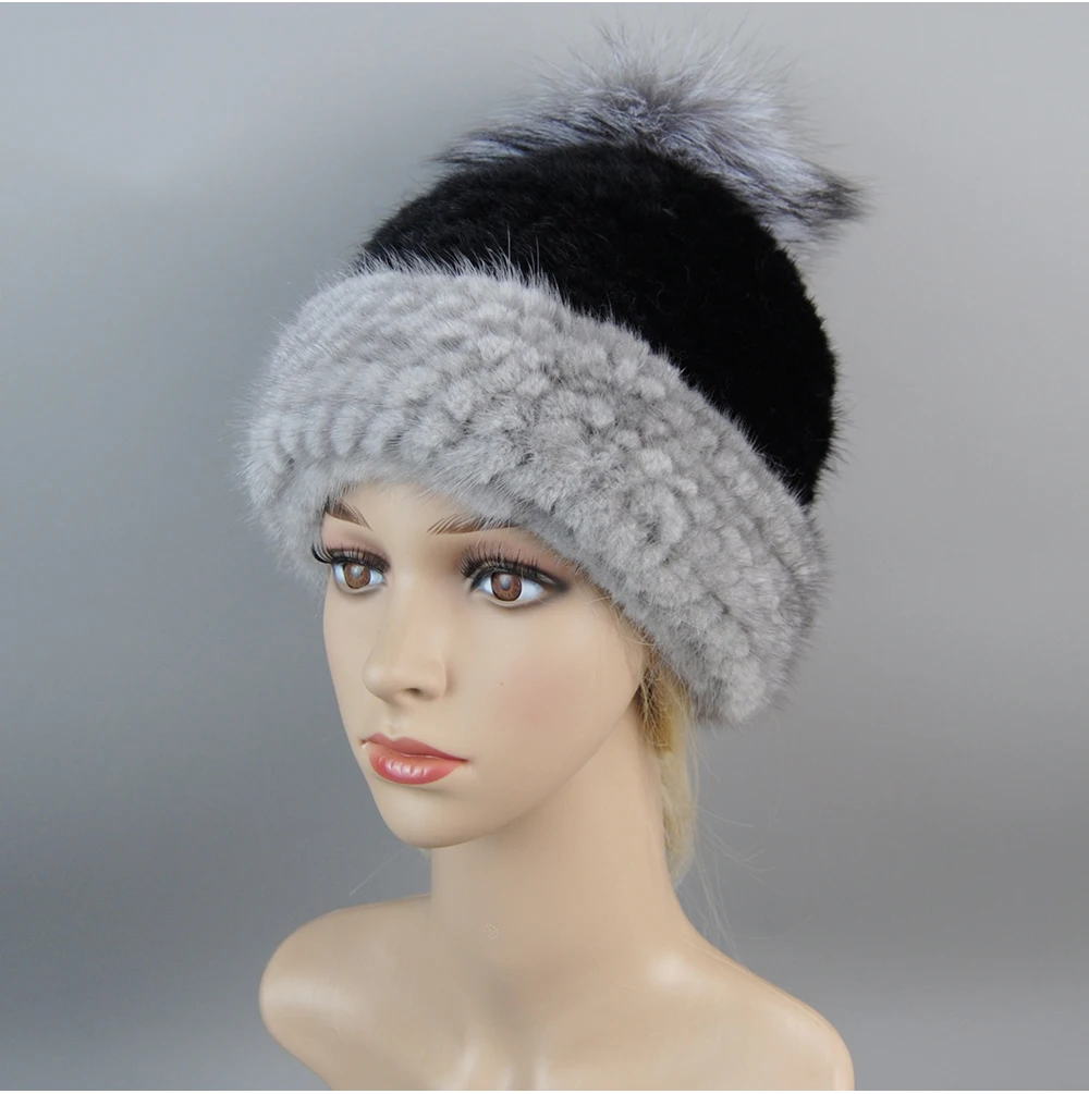 Real Mink Fur Hat For Winter Women Imported Knitted Mink Cap With Fox Fur New Hot Sale High Quality Women Beanies Hat